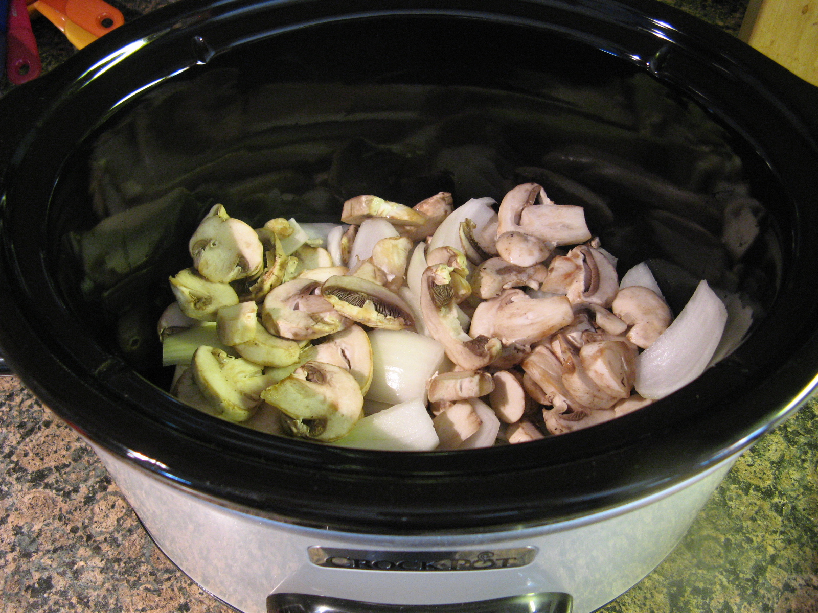 To begin I placed the mushrooms and onions in the bottom of my slow cooker.