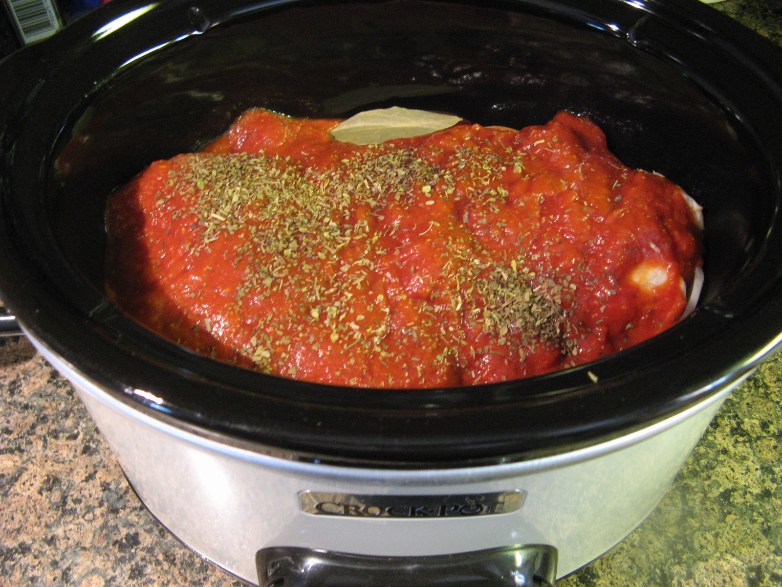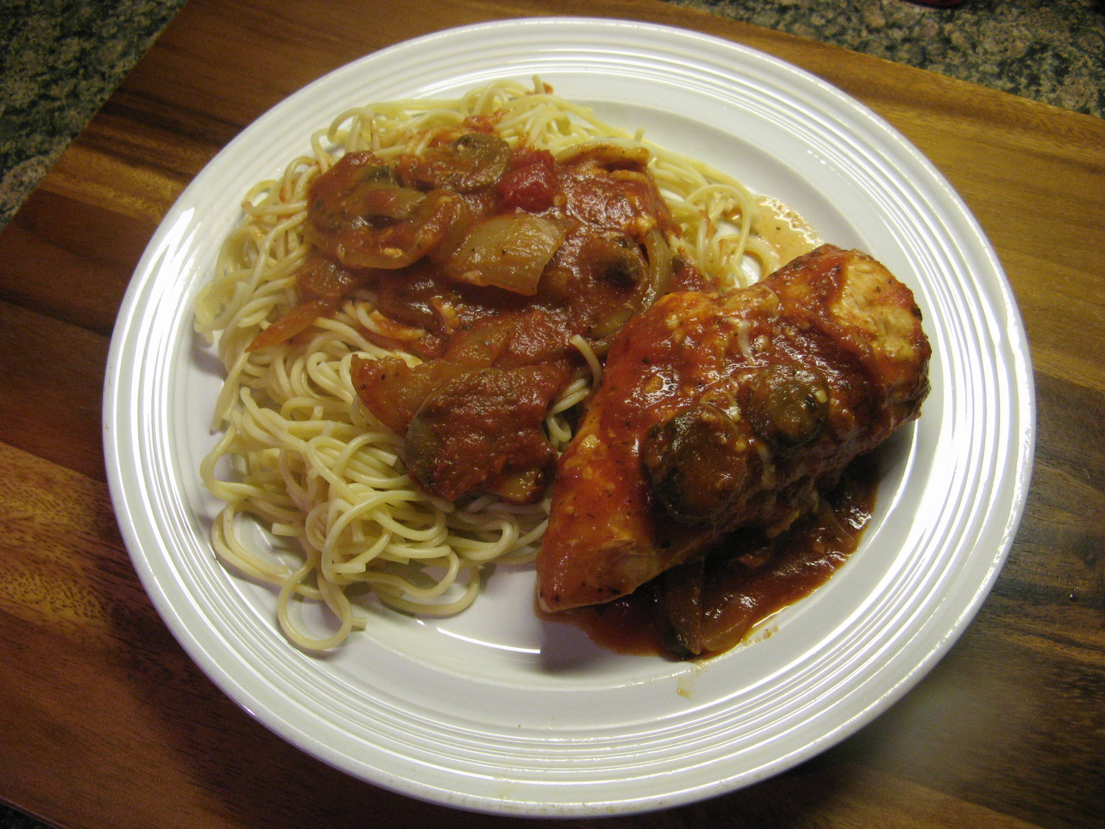 Normally when I make Chicken Parmesan it’s because I have leftover breaded cutlets from the night before. I don’t know why, but, it just never crosses my mind to make Chicken Parmesan the same day I am frying up the breaded cutlets. Maybe it’s so I can have something different the following night… leftovers are good but they are even better when you can spruce them up into something different. For today’s Slow Cooker Sunday I am bringing you Chicken Parmesan that’s lacking the breading but definitely healthier without it and also because there’s no frying involved and you get some veggies in the mix – mushrooms and onions.
