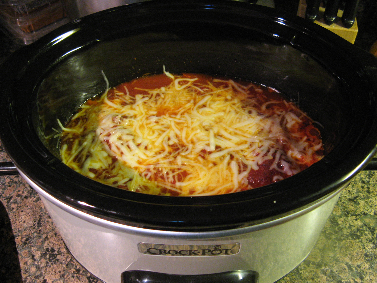 After cooking it on low for about 7 hours I removed the cover and sprinkled it with parmesan and mozzarella cheeses and left it uncovered for about 15 minutes, until the cheeses were melted.