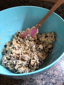 Fold in the flour mixture until just combined and then add in the chocolate chips. Continue folding until the dough forms.