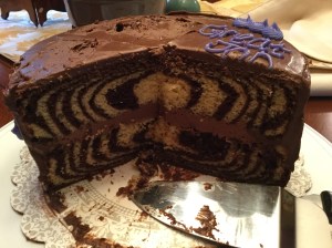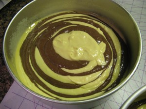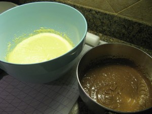 I began by baking two 9-inch square chocolate cakes. After letting the cakes cool, I wrapped them in plastic wrap and left them on my kitchen counter. The following day I made a chocolate mousse filling for the cake and I took a major short-cut and used store bought chocolate frosting. I haven’t quite mastered making chocolate frosting myself. Anyone have a good foolproof recipe they can share? I leveled, filled and frosted the cake and then placed it in the refrigerator overnight.