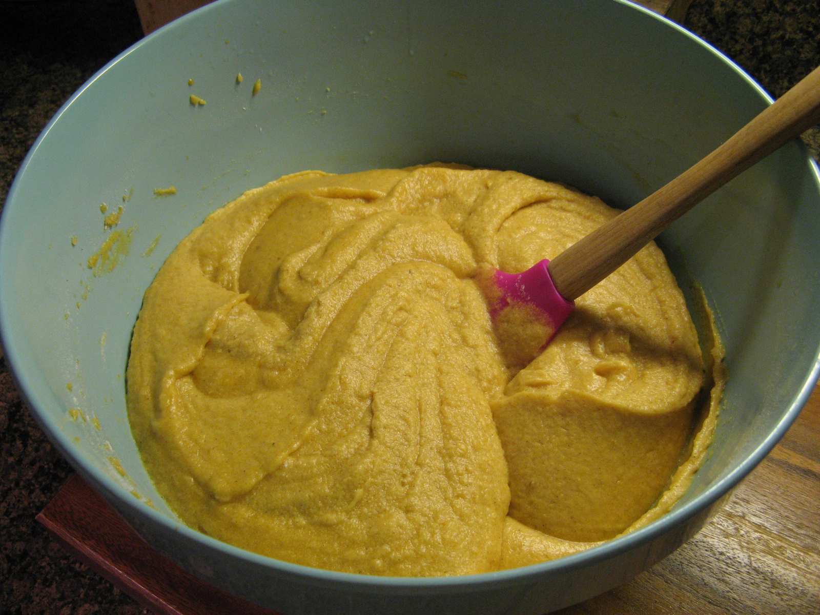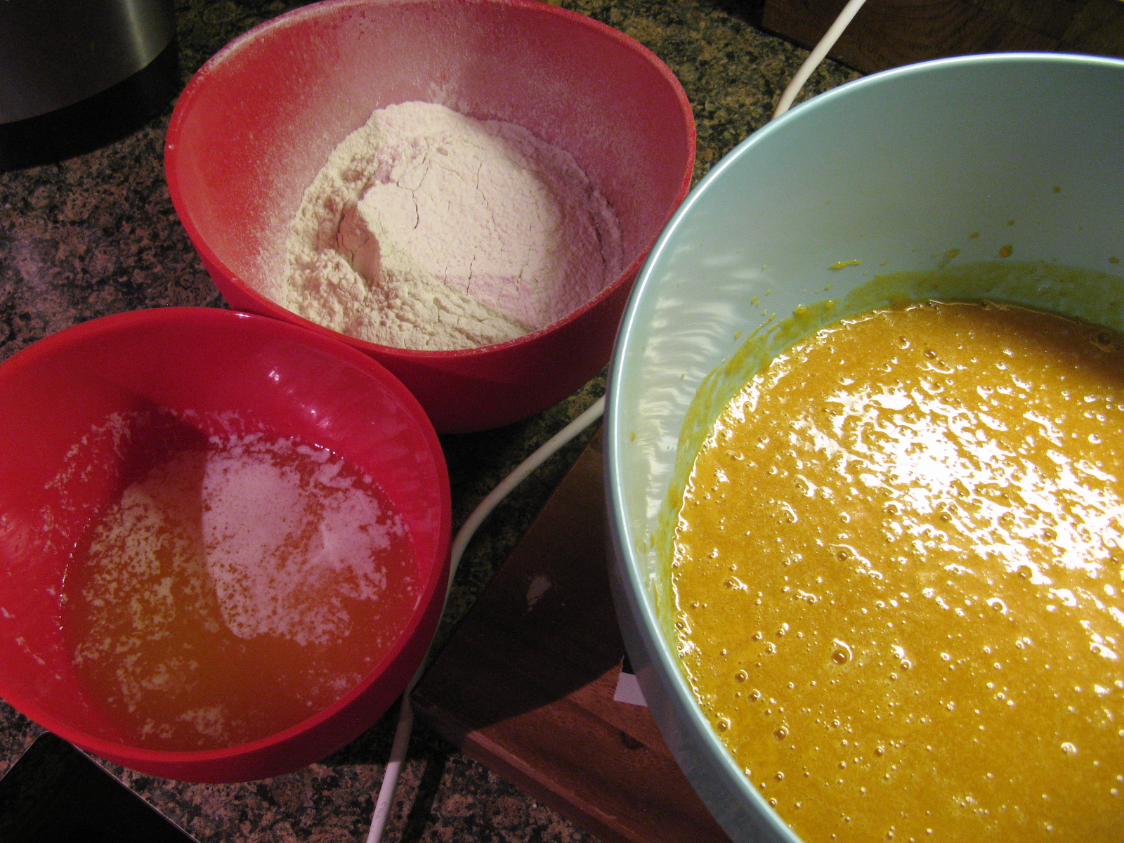 In one bowl I sifted together flour, cinnamon, ginger, nutmeg and salt. In another bowl I combined 9 eggs, 2 1/2 cups of pumpkin puree and 4 1/3 cups of sugar. And finally, in another bowl I melted 1 2/3 cups of unsalted butter. YIKES! I’ve made brownies from scratch before and usually they require about 4 eggs or so and definitely not that much sugar. Oh, and if you didn’t know 1 2/3 cups of butter is roughly 27 tablespoons! So, I had my doubts, but I plowed ahead.