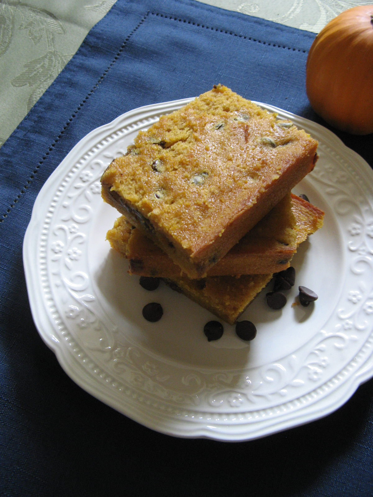 Ingredients: 2 1/4 cups flour 1 1/4 teaspoon cinnamon 1/8 teaspoon ginger 1/4 teaspoon nutmeg 1/4 teaspoon salt 9 large eggs 2 1/2 cups pumpkin puree 4 1/3 cups sugar 1 2/3 cups unsalted butter, melted 1 1/2 cups semi-sweet chocolate chips Directions: Preheat oven to 350 F. Grease an 18 x 12 inch rimmed baking sheet. In a medium bowl sift together the flour, cinnamon, ginger, nutmeg and salt. In a large bowl, using an electric mixer, beat together the eggs and the pumpkin puree on medium speed until well combined. Add the sugar and continue beating until all ingredients are well combined. With the mixer running, slowly add the melted butter to the pumpkin mixture. Gradually add in the flour mixture until fully incorporated, scraping the sides of the bowl as necessary. Stir in the chocolate chips. Spread the batter into the prepared baking sheet and bake for about 45 minutes, until a cake tester or toothpick inserted in the center comes out clean. Cool completely and then slice. Recipe from Buddy Valastio People MagazinePumpkin Chocolate Brownies