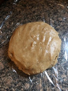 While the butter cooled I combined the dry ingredients in a medium bowl. Once the butter cooled, I mixed in granulated sugar, dark brown sugar, eggs, vanilla extract and finally the flour mixture until the dough formed. I then transferred it to a piece of plastic wrap and shaped it into a disk and refrigerated it for an hour. The dough needs to be refrigerated because it is extremely soft. Thanks to the brown butter, the dough (and ultimately the cookie itself) had a nice mocha color.