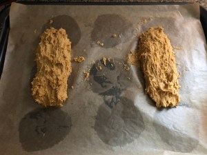 In a large bowl whisk together the brown sugar and cooled brown butter. It should resemble clumpy wet sand. Next whisk in the egg yolk, maple syrup, vanilla extract and pumpkin puree until smooth. Fold in the dry ingredients. Continue folding the two mixtures together until the dough forms.