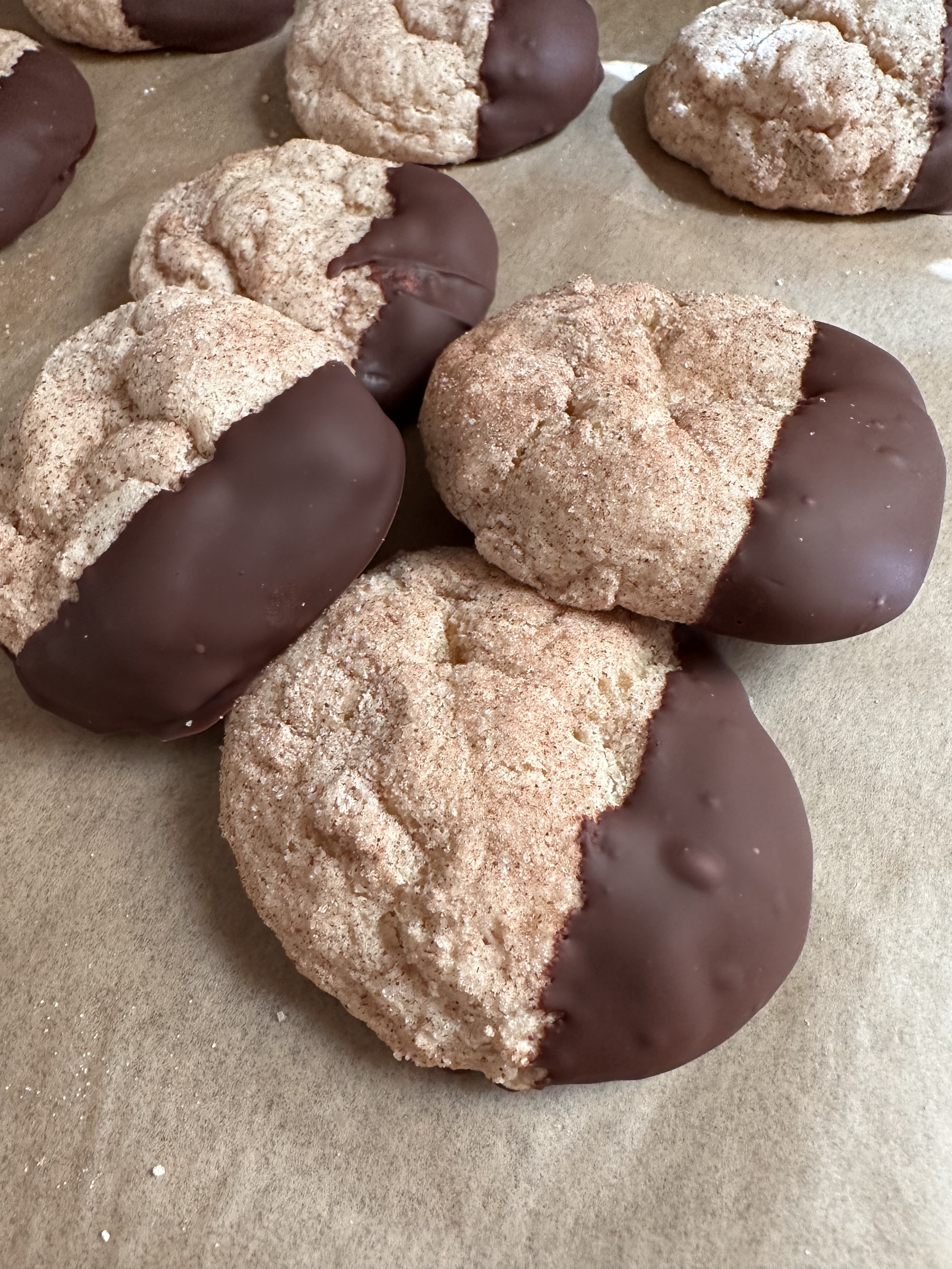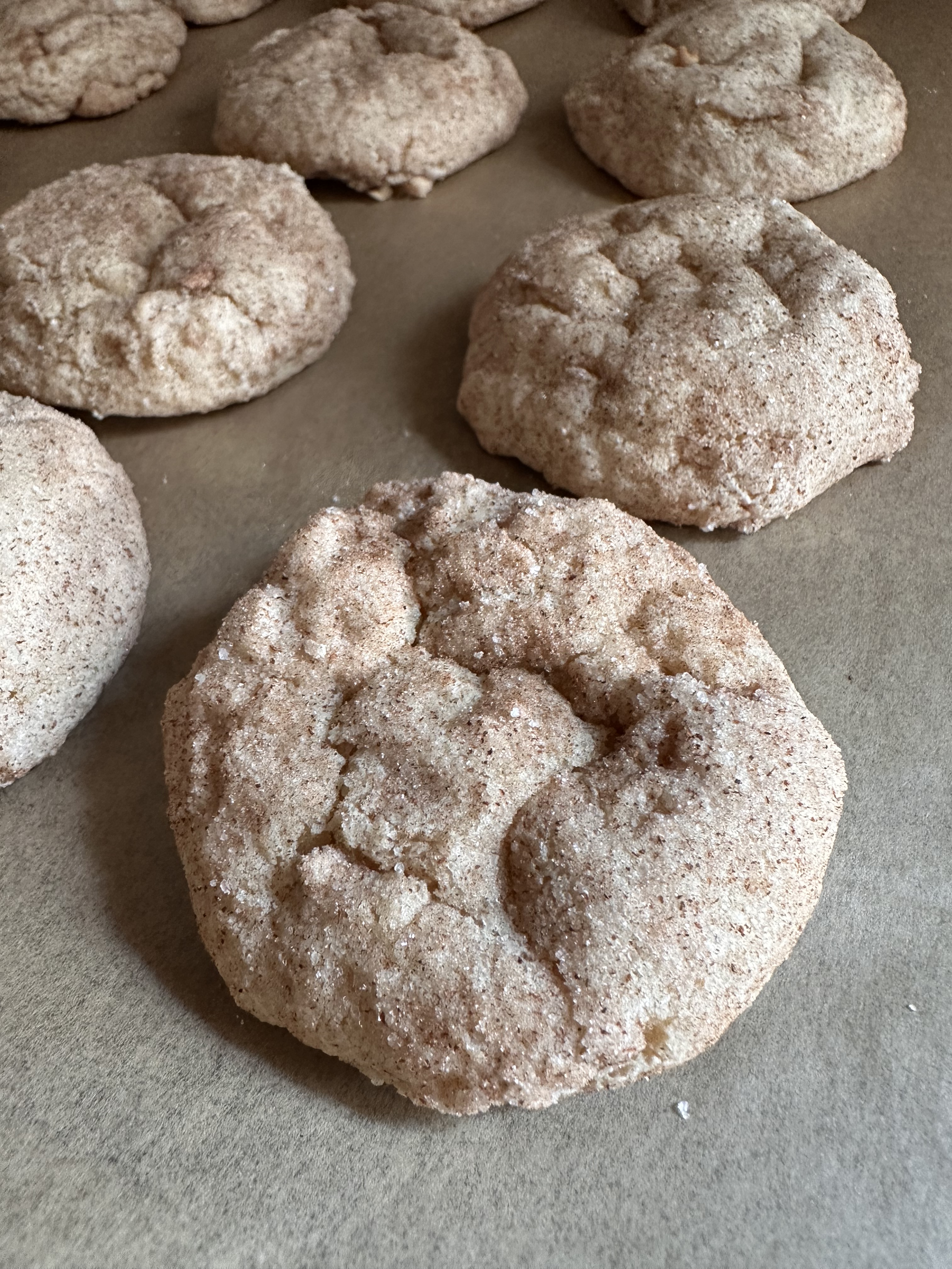 Use a large cookie scoop (i.e. ice cream scoop) or 1/4 measuring cup to scoop out the dough and then roll in the sugar coating. Place on the prepared baking sheet about 3 inches apart.