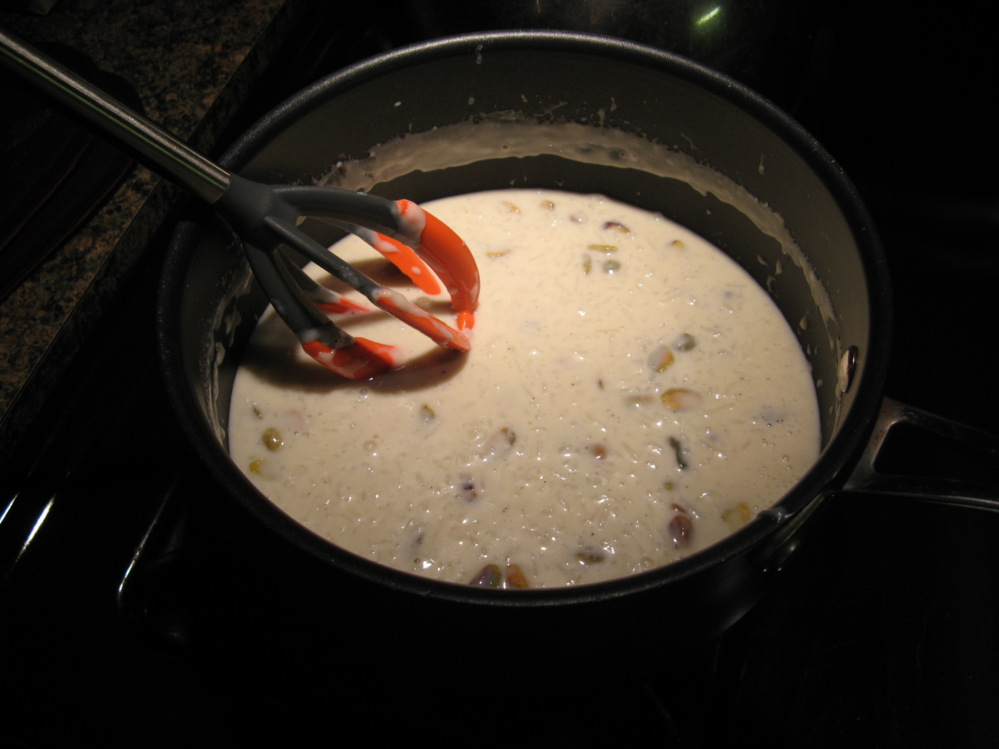 I then returned the chicken to the pot along with water and the remaining coconut cream and milk from the can and cooked it covered on medium-low heat, for about 15 minutes until the sauce was thickened and the chicken was cooked through, about 15-20 minutes. And finally, I added in a cup frozen peas and carrots thawed and cooked everything until the pear and carrots were warmed through. I then seasoned it with salt and pepper.