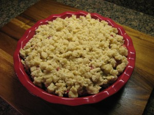 I then topped the peaches with chopped pecans and the crisp topping. I used my hands to break up the slightly frozen topping into small pieces that I scattered on top of the peaches.