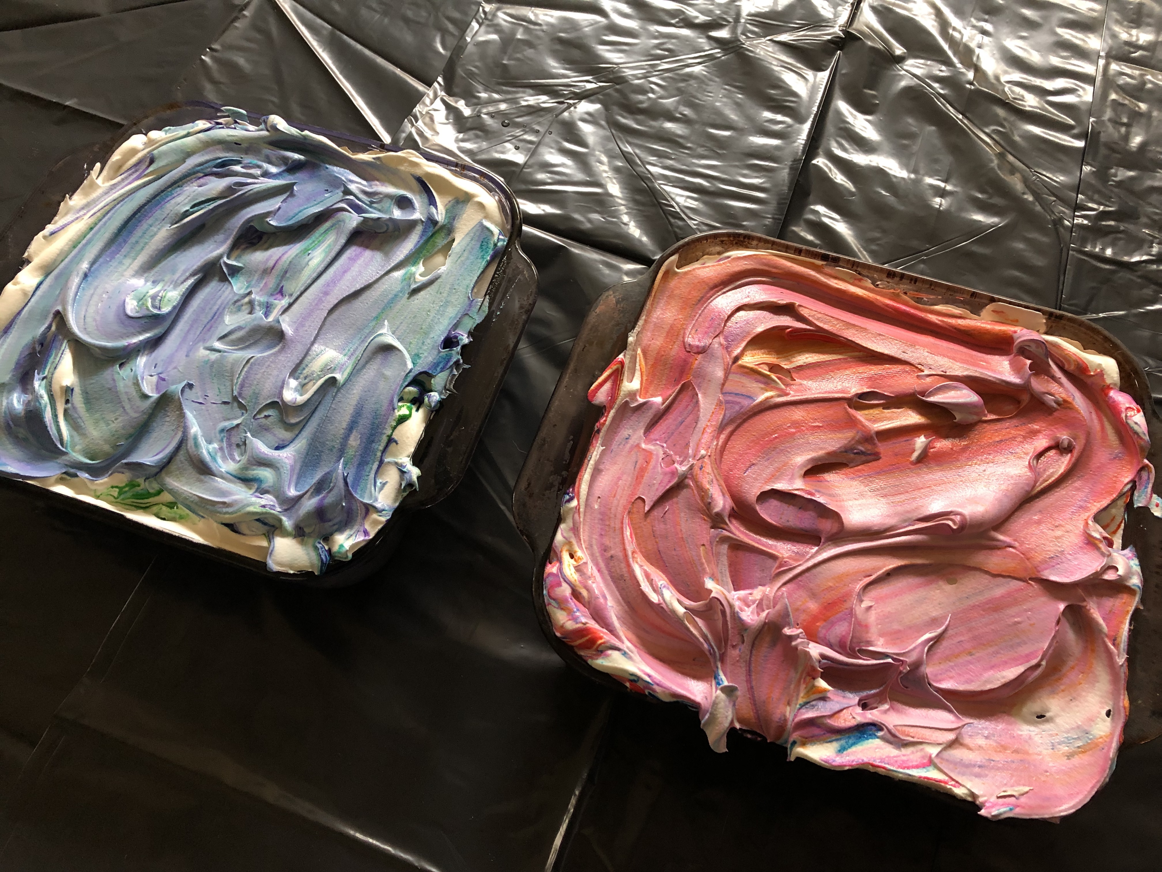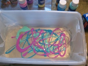 There are plenty of creative ways to dye Easter eggs… The traditional way of using water, vinegar and food coloring, the all-natural method of using vegetables and spices or the fancy way of using silk ties. And then there are bunch of different methods in between. One of those, the shaving cream method. With this method you swirl food coloring into a dish of shaving cream and then set the eggs in the cream so they can absorb the color swirl. The only problem with this method is that the shaving cream makes the eggs inedible since egg shells are porous. I definitely don’t think it’s safe to eat a hard-boiled egg that may have traces of shaving cream on it. So, instead of shaving cream you can use whipped topping to achieve the same results and also have eggs that are still safe to eat after decorating.