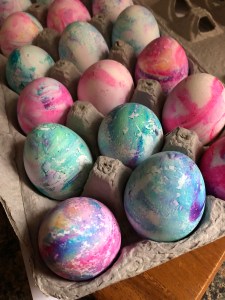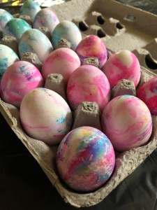 Now, you can make your own whipped cream if you choose, but, I opted to buy frozen whipped topping, aka Cool Whip. I placed it in the refrigerator overnight so that it could defrost. Once defrosted, I emptied the contents of 2 8oz. tubs of whipped topping into a 9×9-inch baking dish. Next, I dotted the top with gel food coloring. I opted to use three colors, I wouldn’t suggest using more colors than three as the colors can get really muddled together then. I would also try avoid using colors that when blended together make a new color, i.e. red and yellow (orange), blue and yellow (green), red and blue (purple), and so forth. Using a toothpick I swirled the colors into the topping, making sure to get the color into the bottom of the dish as well so that when I submerged the eggs they would be completely covered with the dyed whipped topping. I then placed the eggs in the whipped topping. I fit about 9 eggs in the 9×9-inch dish. I covered the top of the eggs with the whipped topping and I let the eggs sit there for about 15-20 minutes. The longer the eggs sit, the more vibrant the colors will be.