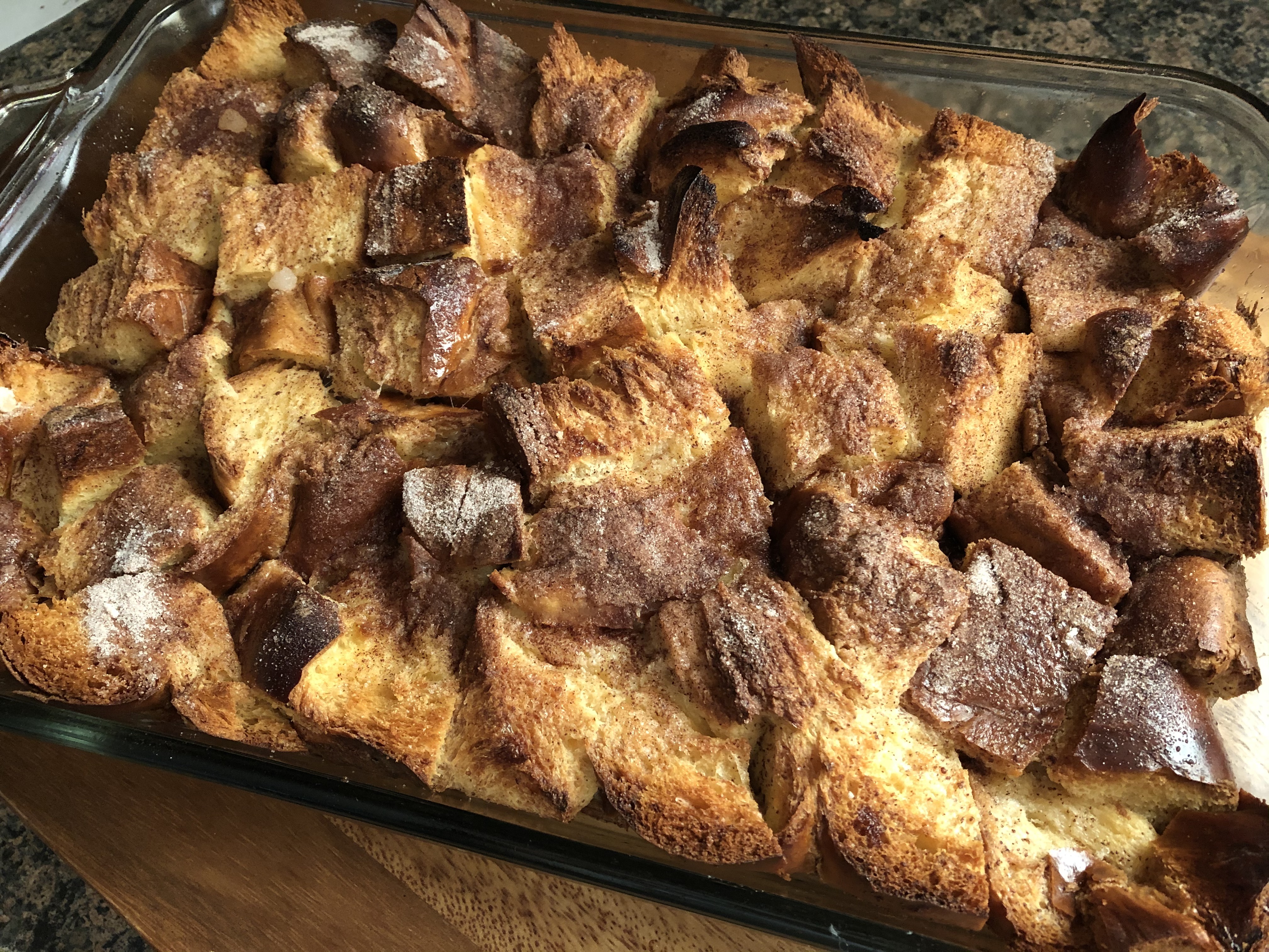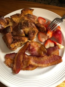 I prepped it the night before by cutting up a loaf of challah bread and arranging it in a 9×13 baking dish that I lightly greased. I then poured a mixture of eggs, milk, heavy cream, sugar and spices over it and covered and refrigerated it overnight. The following morning, I removed it from the refrigerator and while I preheated the oven drizzled it with melted butter and a cinnamon sugar mixture. I baked it for about 40 minutes, until it was puffy and golden brown.