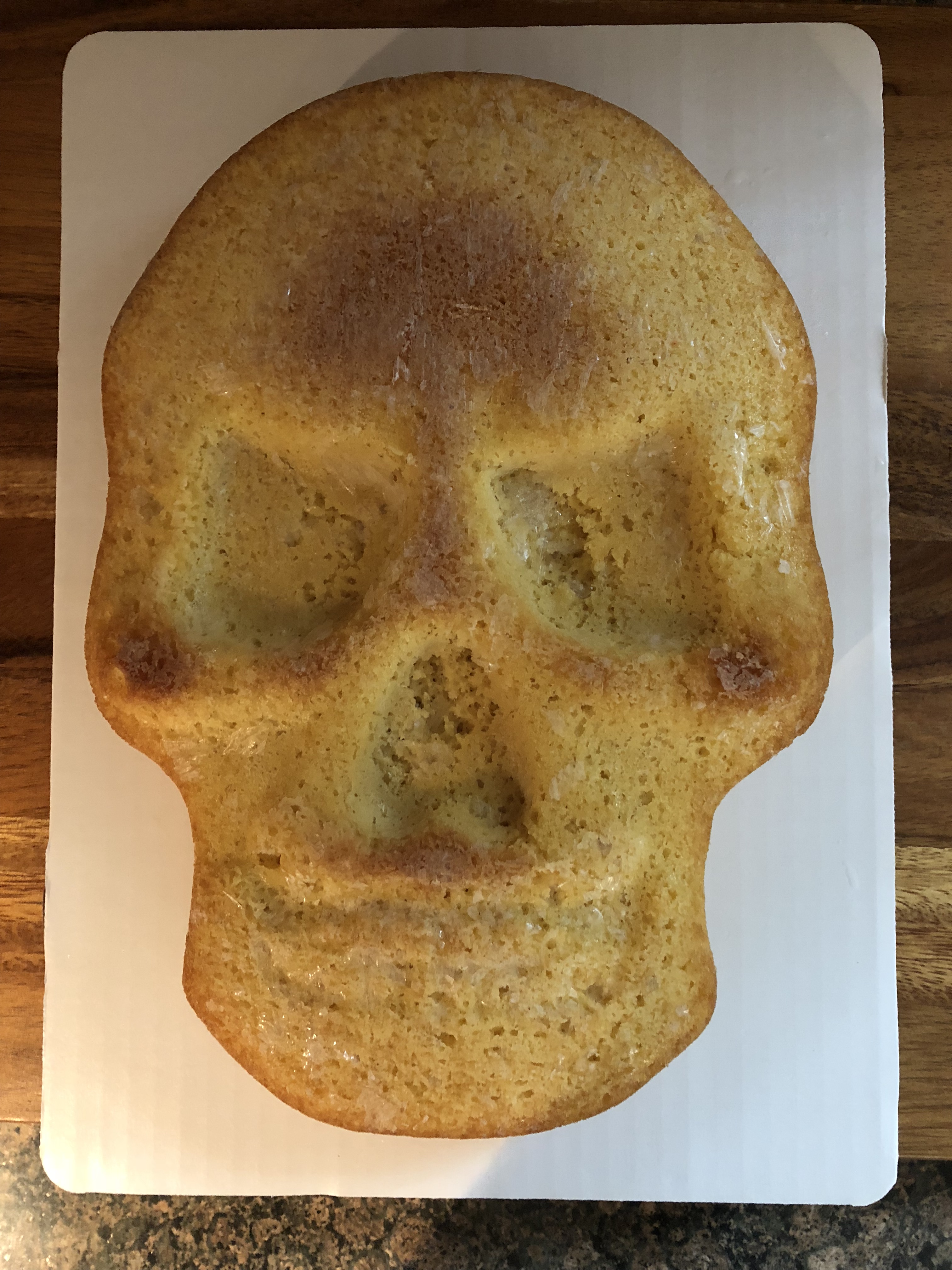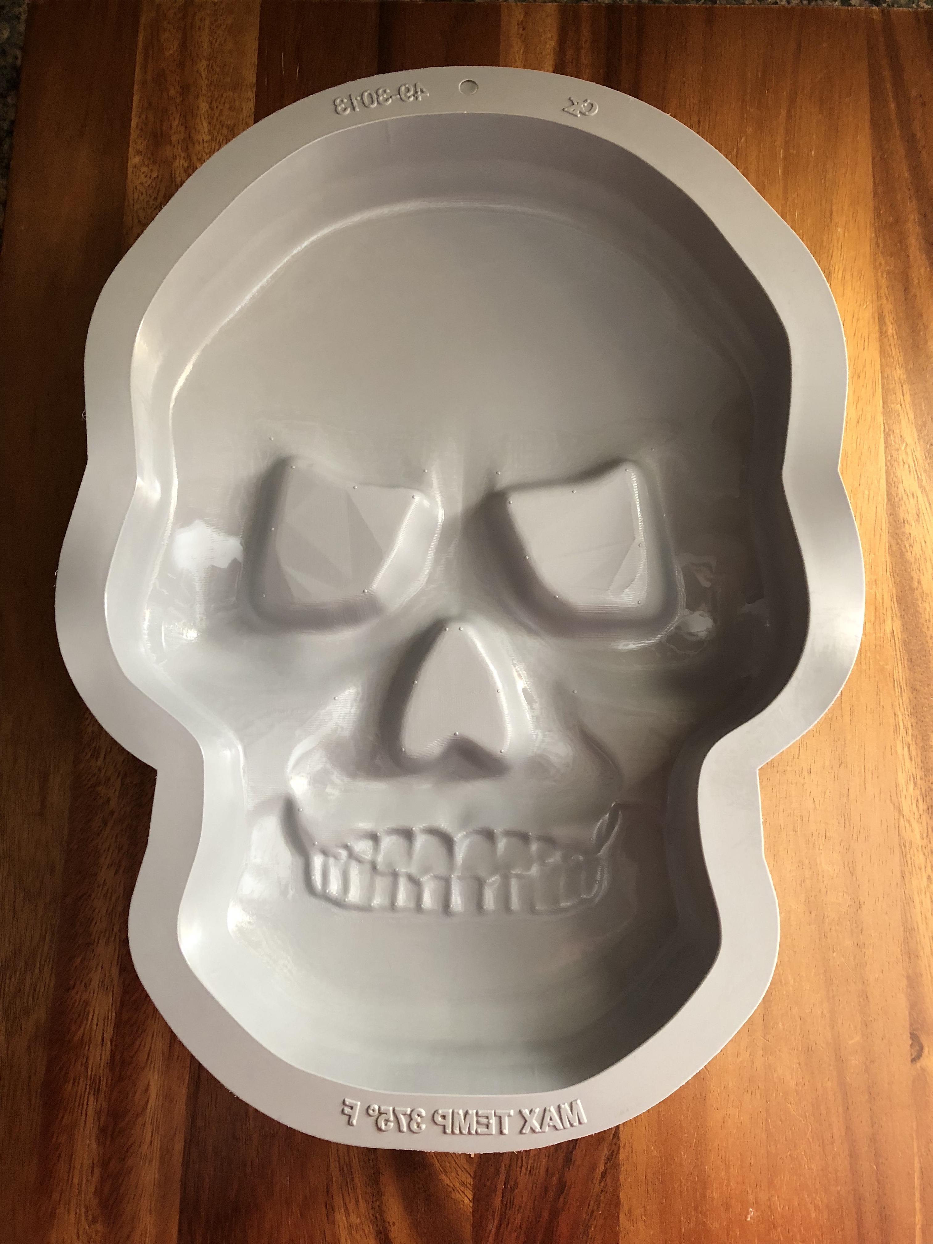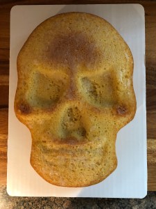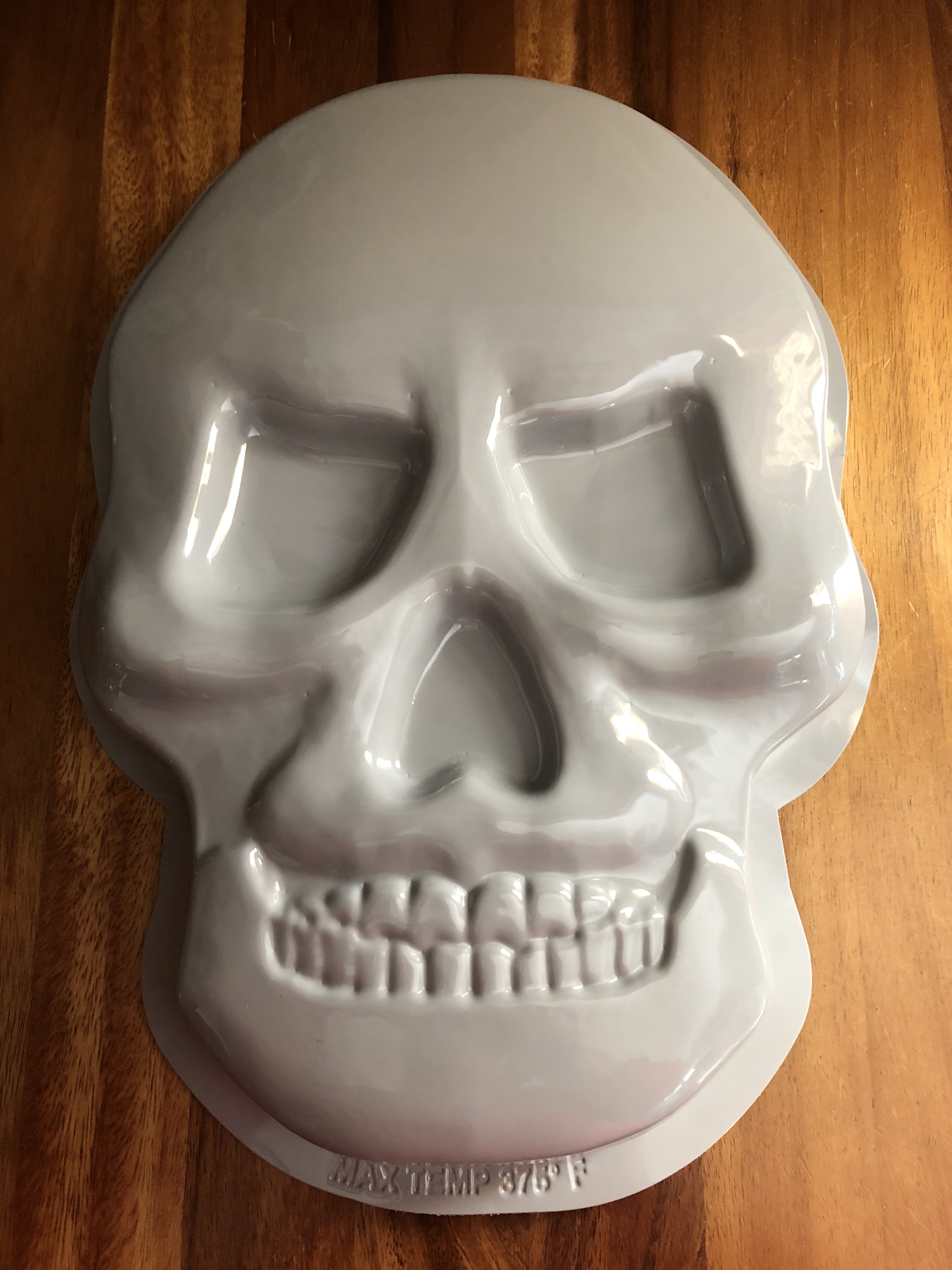 I purchased a skull pan from The Cake Girls website to create the mummy. Now, if you are a good cake carver you could simply bake a box cake mix (or your favorite cake recipe) in a 9×13 inch pan and then carve out the shape of a skull. Or, if you already own one here’s a new idea to put it to good use. I own quite a few shaped pans that I’ve only used once, but I won’t part with them just in case.