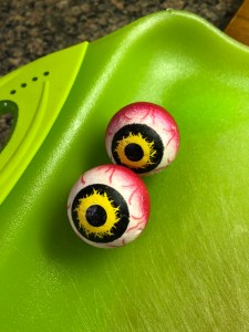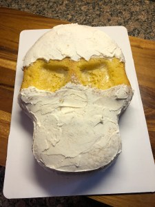 Okay, so once my frostings were ready it was time to get to work. I started by applying a thin coat of white frosting on the skull leaving the eye socket area uniced. I iced the socket area and the sides of the cake in that area with the black frosting. At this point I placed the cake in the fridge for a few minutes because I found that the black frosting wasn’t smooth as I was getting a lot of crumbs mixed into it. While the cake was in the refrigerator I prepped two piping bags with two different tips, Ateco #128 (an XL rose decorating tip) and # 45 (a flat decorating tip), and filled each with the white frosting. Also, I prepped the eyeballs for the cake. I purchased Styrofoam eyeballs from my local craft store and using a sharp knife sliced them in half so they would sit flat on the cake.