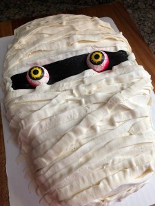 Are you looking for an easy Halloween cake to make? Well, this Mummy Cake might be the one. It’s simple, doesn’t take a lot of time and you don’t need any fancy cake decorating skills to make it. I got the idea and directions from The Cake Girls. They have an online shop with a bunch of cool baking supplies, recipes and step-by-step tutorials with detailed pictures. I first came across their website on a blog I follow, The Cake Blog. A blog that has an array of wonderful recipes and cake decorating ideas and instructions from various bakers and cake designers.