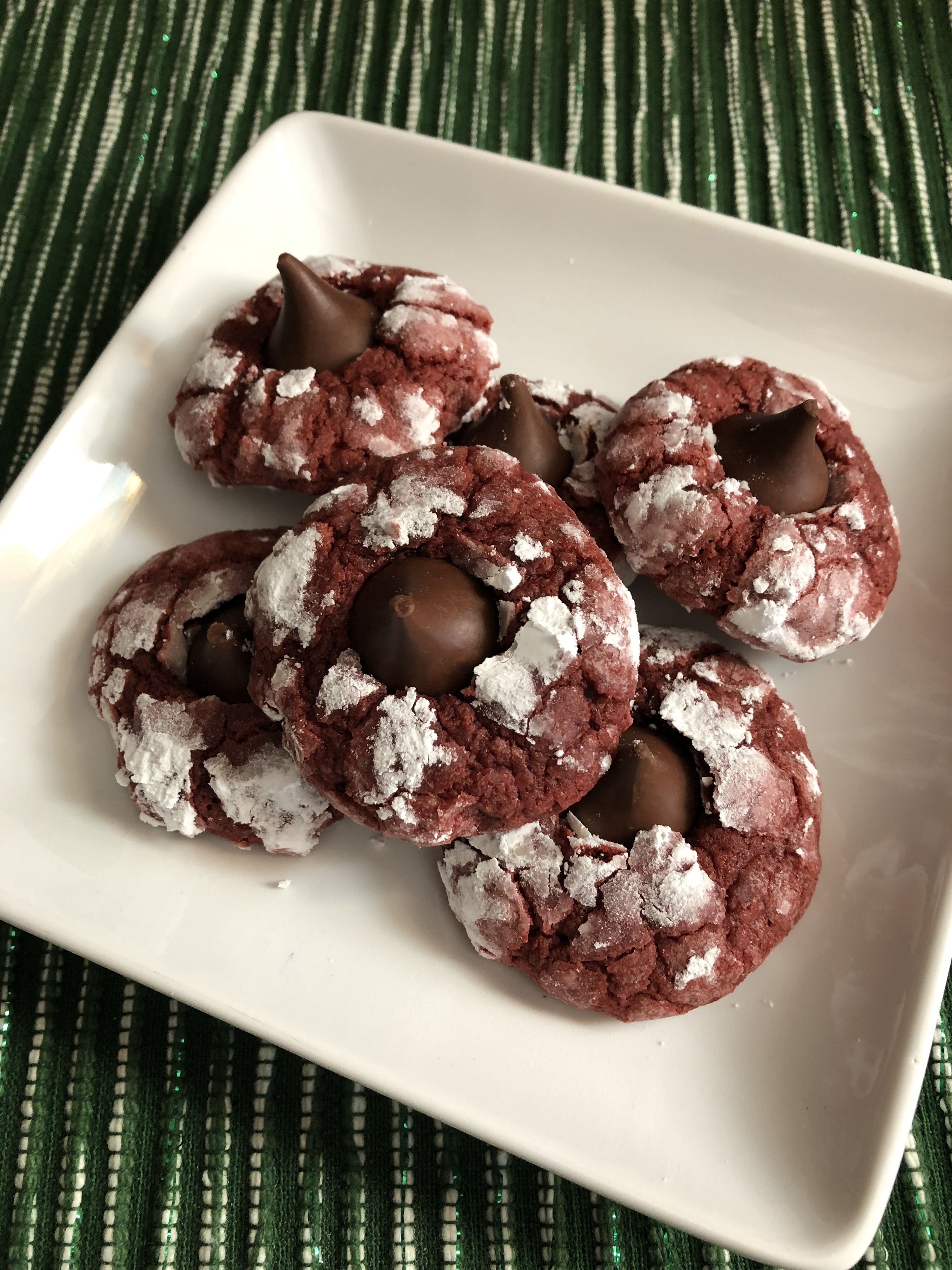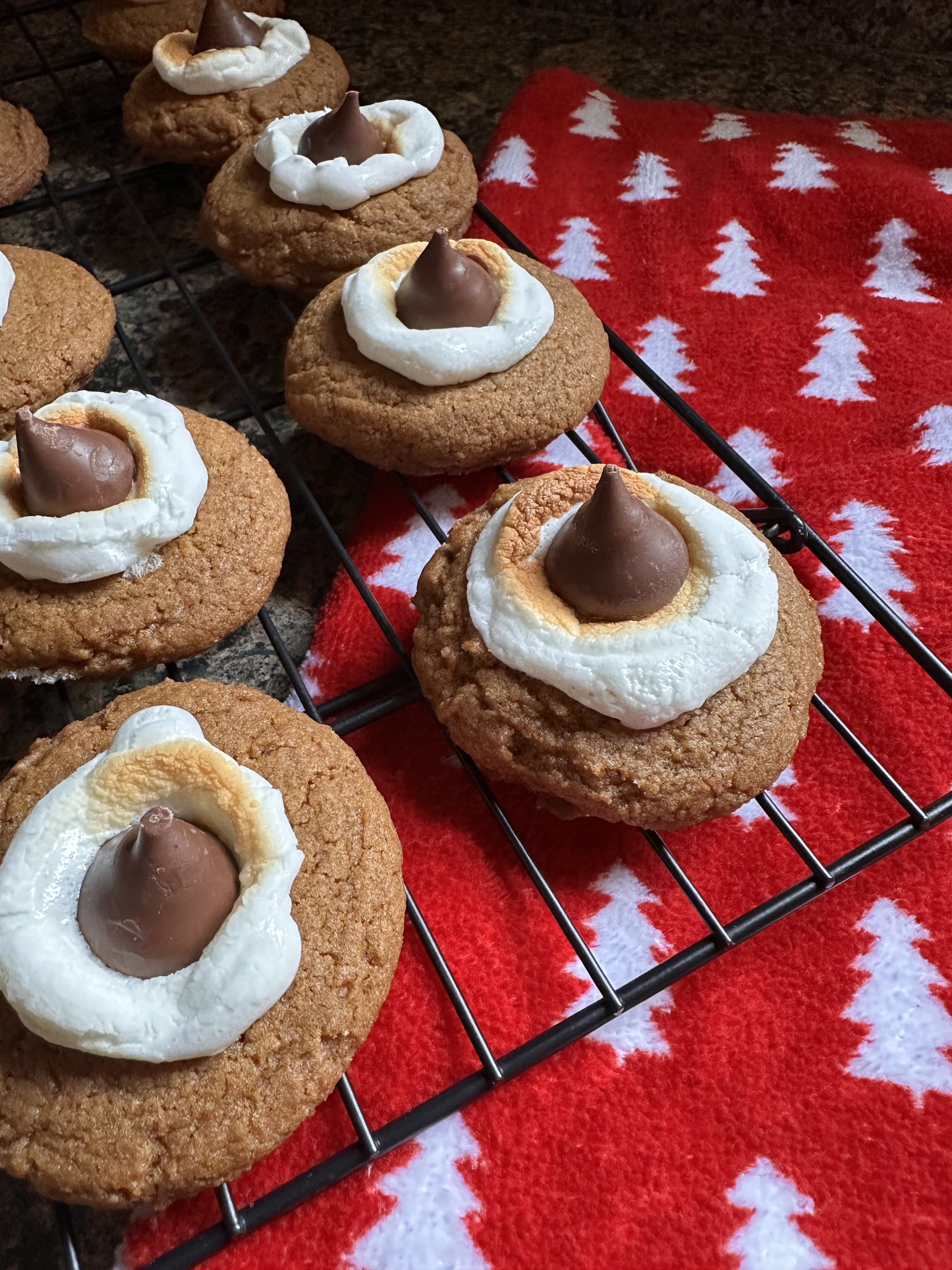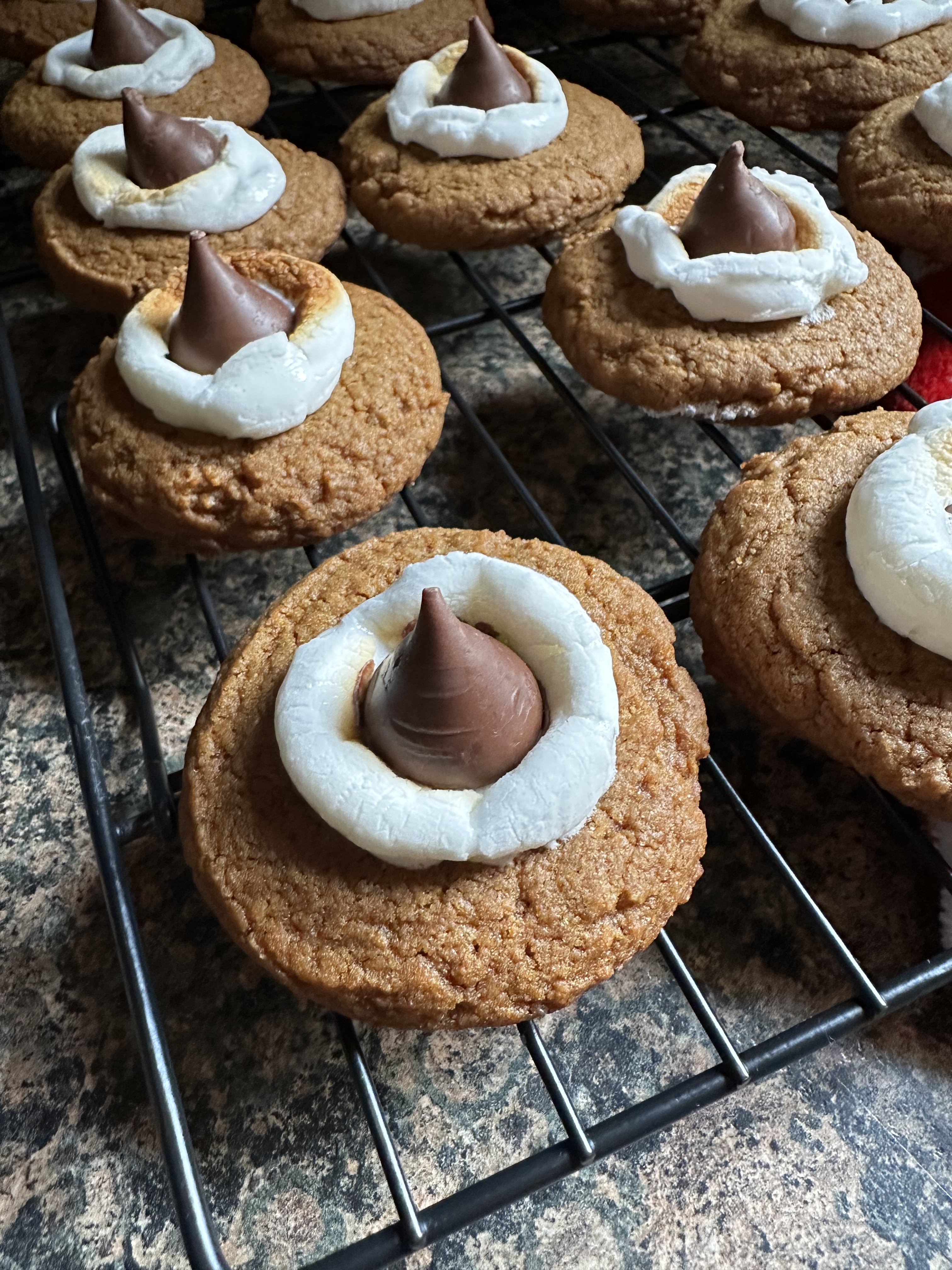 Switch the oven to the broiler setting and place one baking sheet at a time back in the oven for 30-60 seconds, or until the marshmallows begin to brown. Remove from the oven and immediately place a Hershey Kiss in the center of each marshmallow. Transfer the cookies to wire rack to cool completely.