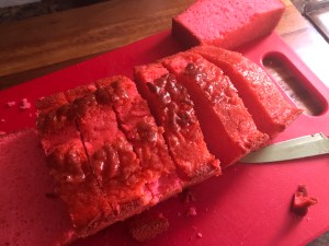 In a large bowl prepare the white cake mix per the directions on the box. Once prepared add in pink food coloring and stir to incorporate the color. Pour the batter into the prepared Bundt pan and bake for 35-40 minutes, or until a cake tester inserted comes out clean. Cool the cake for 15 minutes in the pan and then invert on a wire rack to cool completely. Once cooled, wrap the cake in plastic wrap and refrigerate overnight*.