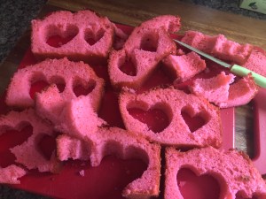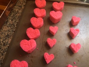 The following morning, I cut the cake into slices (about 2-inches each) and then using a 2-inch heart cookie cutter I cut hearts from those slices. If you like making cake pops, you could use the leftover cake to make some.