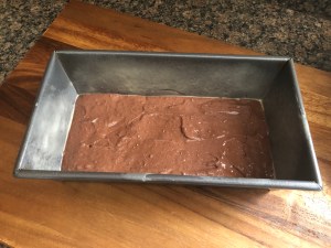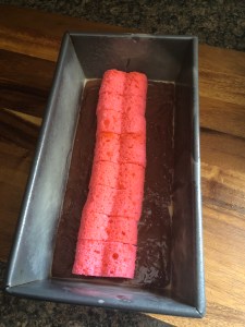 To start I had to make a pink cake for the hearts. After prepping a mix of white cake per the box directions I tinted it pink. I then poured it into a Bundt pan that I sprayed with baking spray. Once it was done, I let it cool in the pan for 15 minutes before transferring it to a wire rack to cool completely. Once cooled, I wrapped it in plastic wrap and refrigerated it overnight. It’s easier and cleaner to cut up a cold cake. I will point out that I was a bit concerned after making this first cake. It didn’t bake up with a lot of height so I was worries that the chocolate cake wouldn’t be able to completely cover the hearts, but, after a little more thinking I realized it shouldn’t be a problem since the hearts would be taking up some of the pan so the chocolate cake would bake up higher.