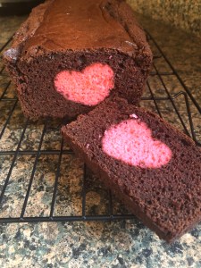 In a large bowl prep the chocolate cake mix per the box directions. Pour enough batter into the pan so there is about a 1/2-inch layer of cake batter on the bottom. Arrange the cut hearts upside down in the pan. They should fit in perfectly and be snugged next to one another. Pour the remaining batter over the hearts, and make sure to get it into the sides of the pan. Bake in the pre-heated oven for 30-35 minutes, or until a cake tester inserted towards the center of the cake comes out clean. Cool the cake in the pan for 15 minutes and then invert onto a wire rack to cool completely.