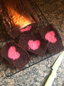 And finally, I poured the remaining cake batter into the pan making sure to cover the hearts and getting the batter on the sides of the hearts closer to the outside of the pan.