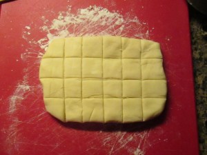 To help divide the dough into 24 somewhat evenly balls I formed the dough into a 6×4-inch rectangle on a lightly floured surface and cut it into 24 squares. I began by scoring it with a pizza cutter and then actually cut it once it had all been scored.