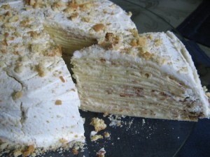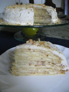 Unfortunately this crepe cake wasn’t a hit amongst my friends who tried it. Not because of the taste but because they weren’t keen on the crepes. They agreed that the lemon curd cream filling between the crepes was good but the crepes themselves not so great. Not so much the flavor, but, the texture. Which I can completely understand. Eating a cake of crepes is nothing like eating a fluffy moist cake. I myself enjoyed it, but, I’m a texture person. In other words, I like sprinkles on my ice cream, nuts in brownies and cookies and so forth. Oh well… You can’t always bake something that everyone will rave about.