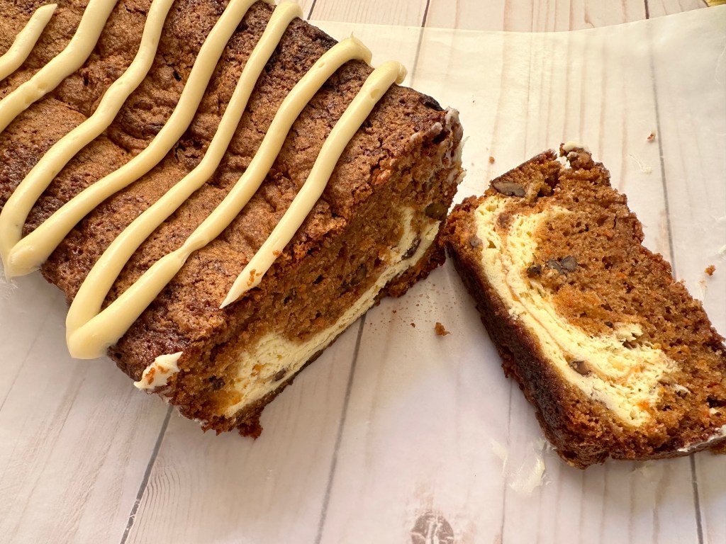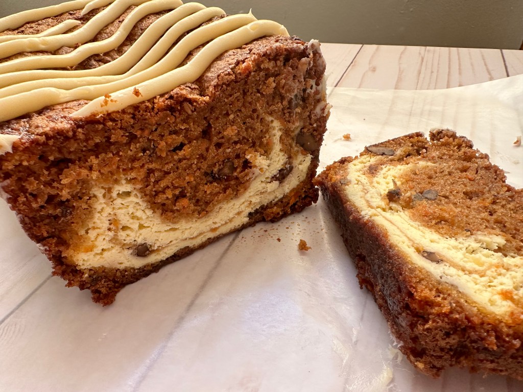 The first thing I did was slice the loaf cake into thirds. To make slicing the cake a bit easier and to reduce the number of crumbs I refrigerated the cake for about an hour.