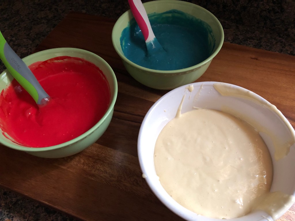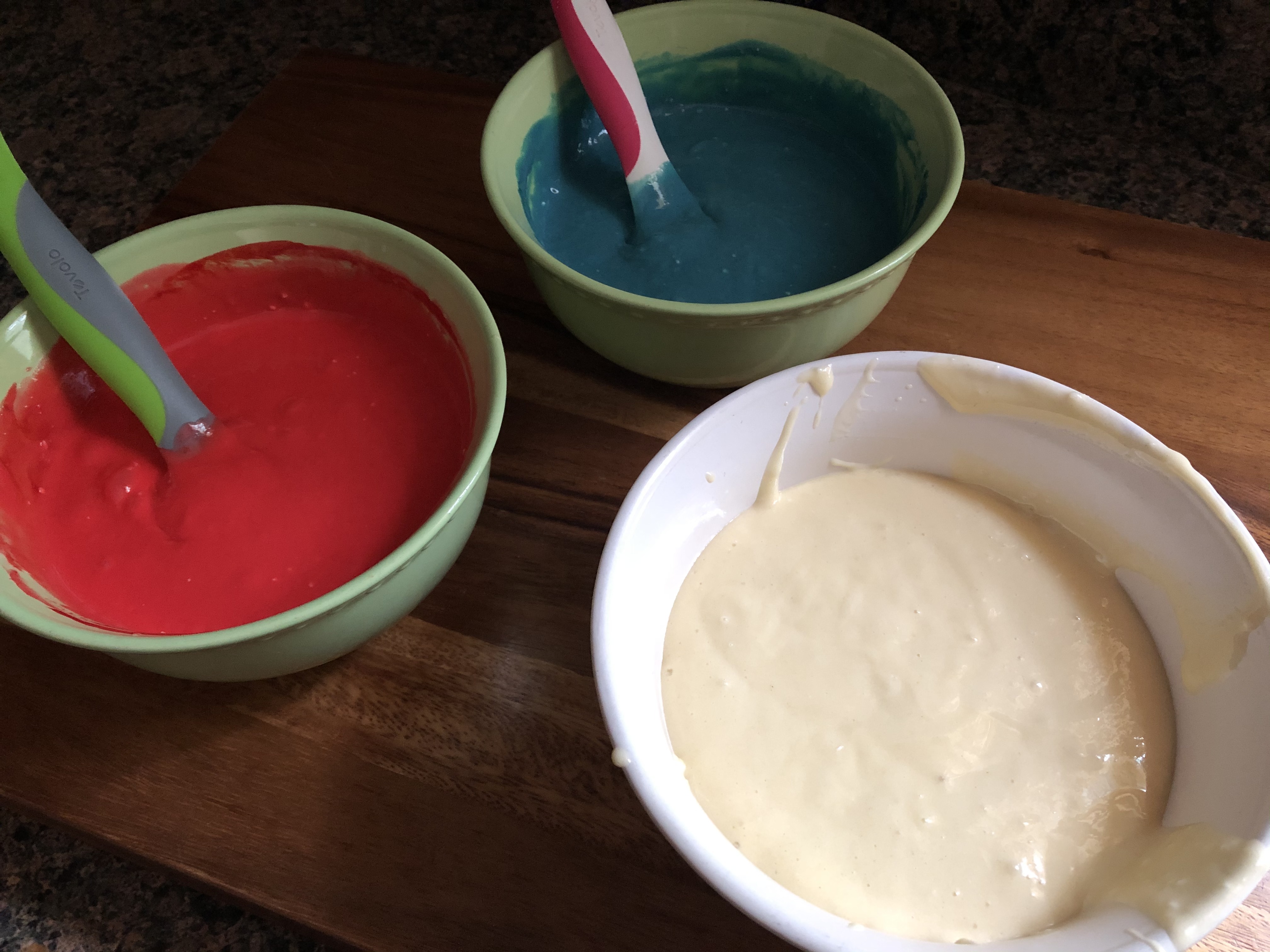 After making the batter I divided it in three (about 1 1/3 cups each) and tinted two of them blue and red respectively and left the third one untinted.