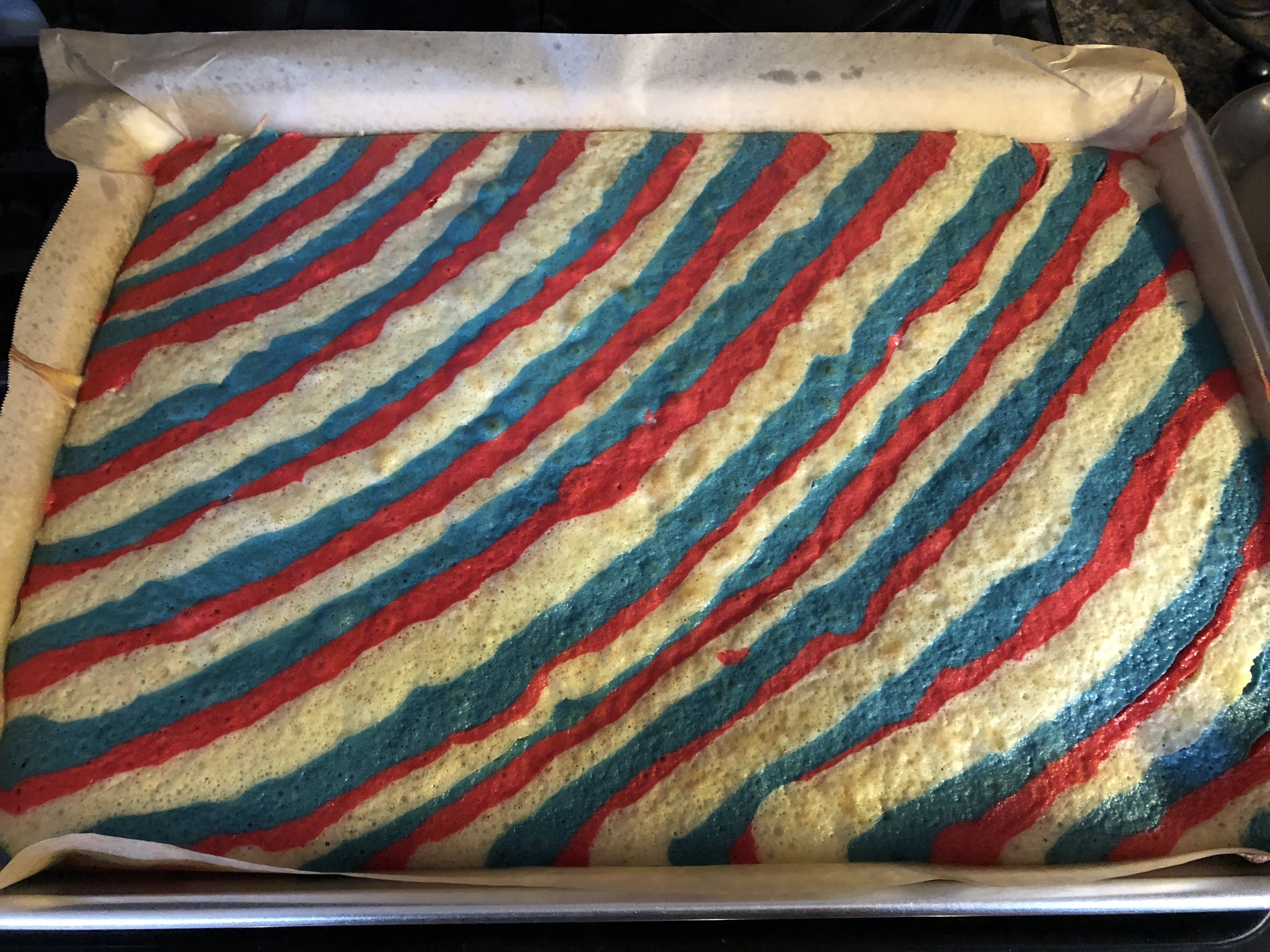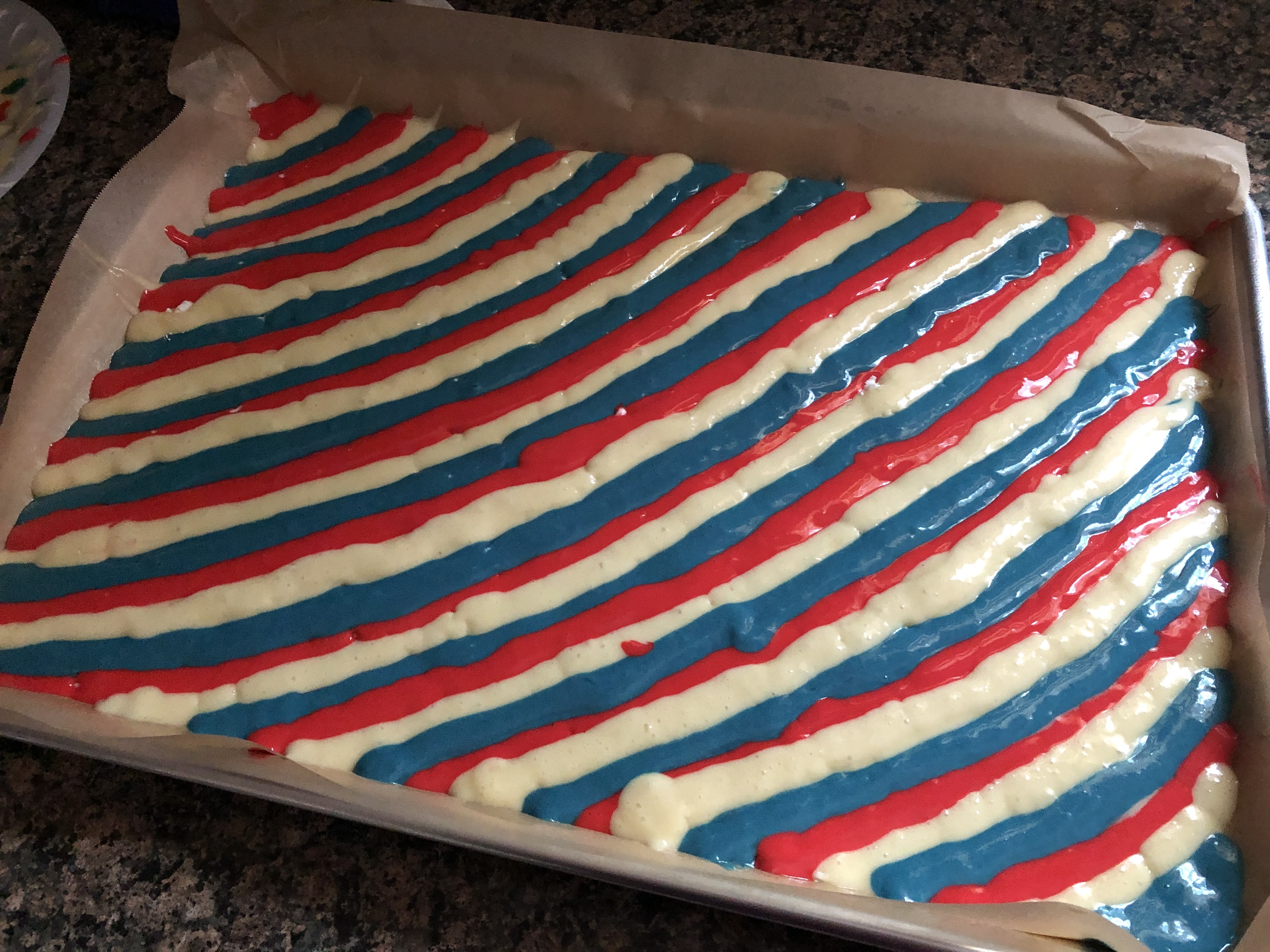 Divide the batter in three, about 1 1/3 cups each. Leave one untinted and tint the other two blue and red respectively. Transfer the batter to pastry bags or resealable plastic bags. Cut a small opening in the bags and pipe the batter diagonally into the prepared pan.