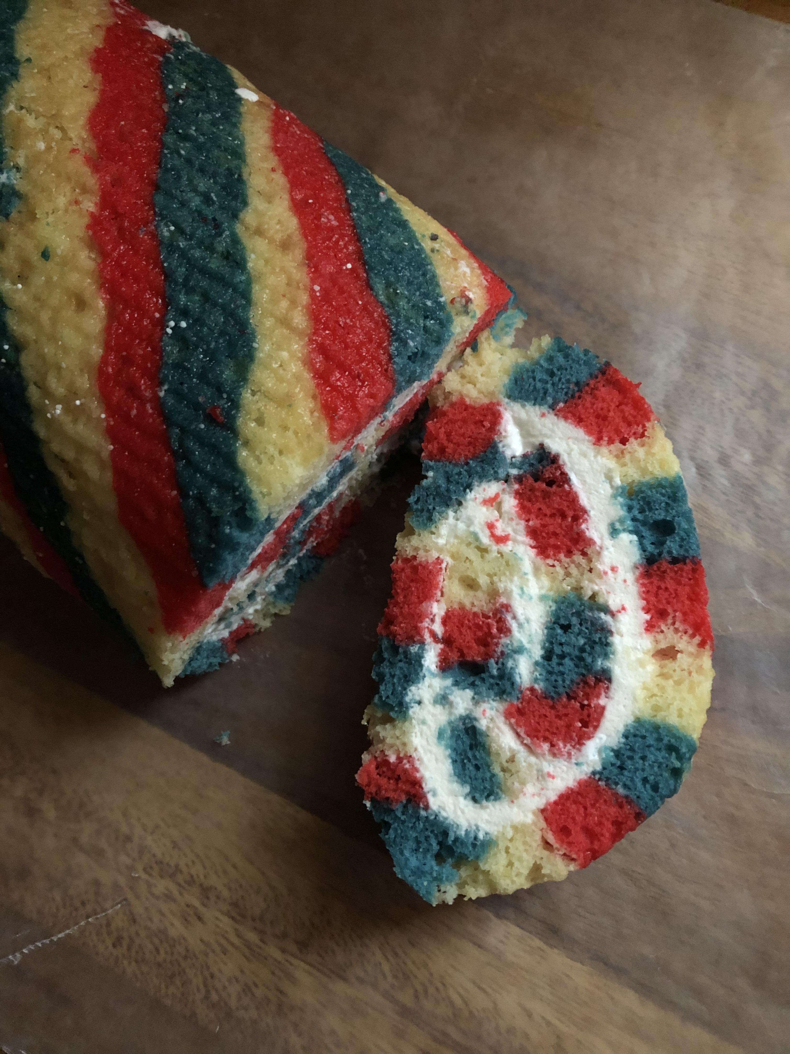 Once the cake was cooled I unrolled it (and yes it did break a little), frosted it and then rerolled it again. I refrigerated it for a few hours before slicing and enjoying.