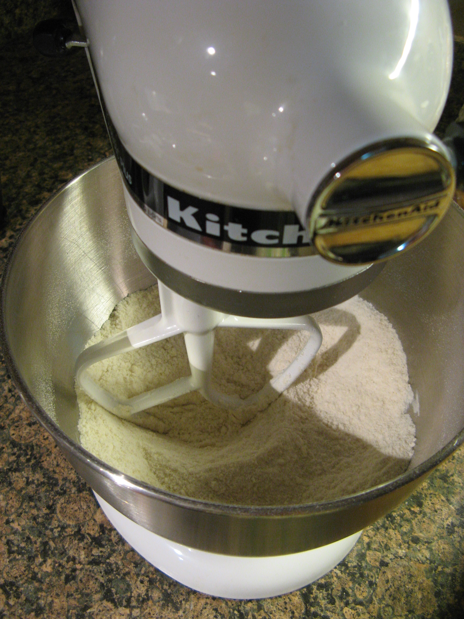 5) Add in sugar and softened butter to your dry ingredients from step 4. Mix with the paddle attachment on low until all is combined and the texture is sandy (the butter mixed with the dry ingredients should feel crumbly/sand-like).