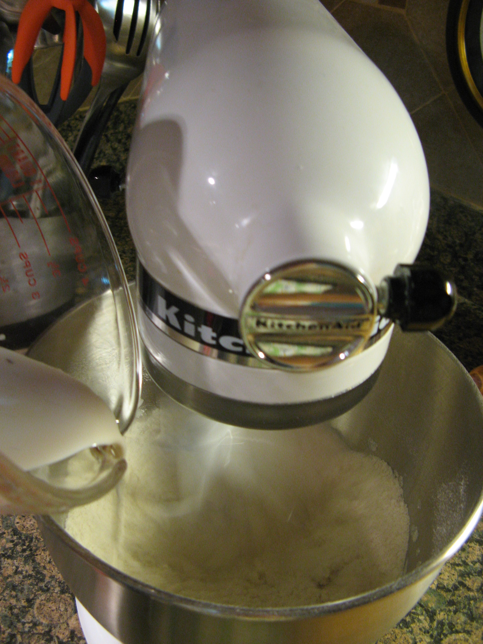 6) With the stand mixer on low, slowly pour the infused milk into the flour mixture and mix just until the last of the milk is combined. Now add in the egg.