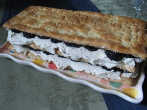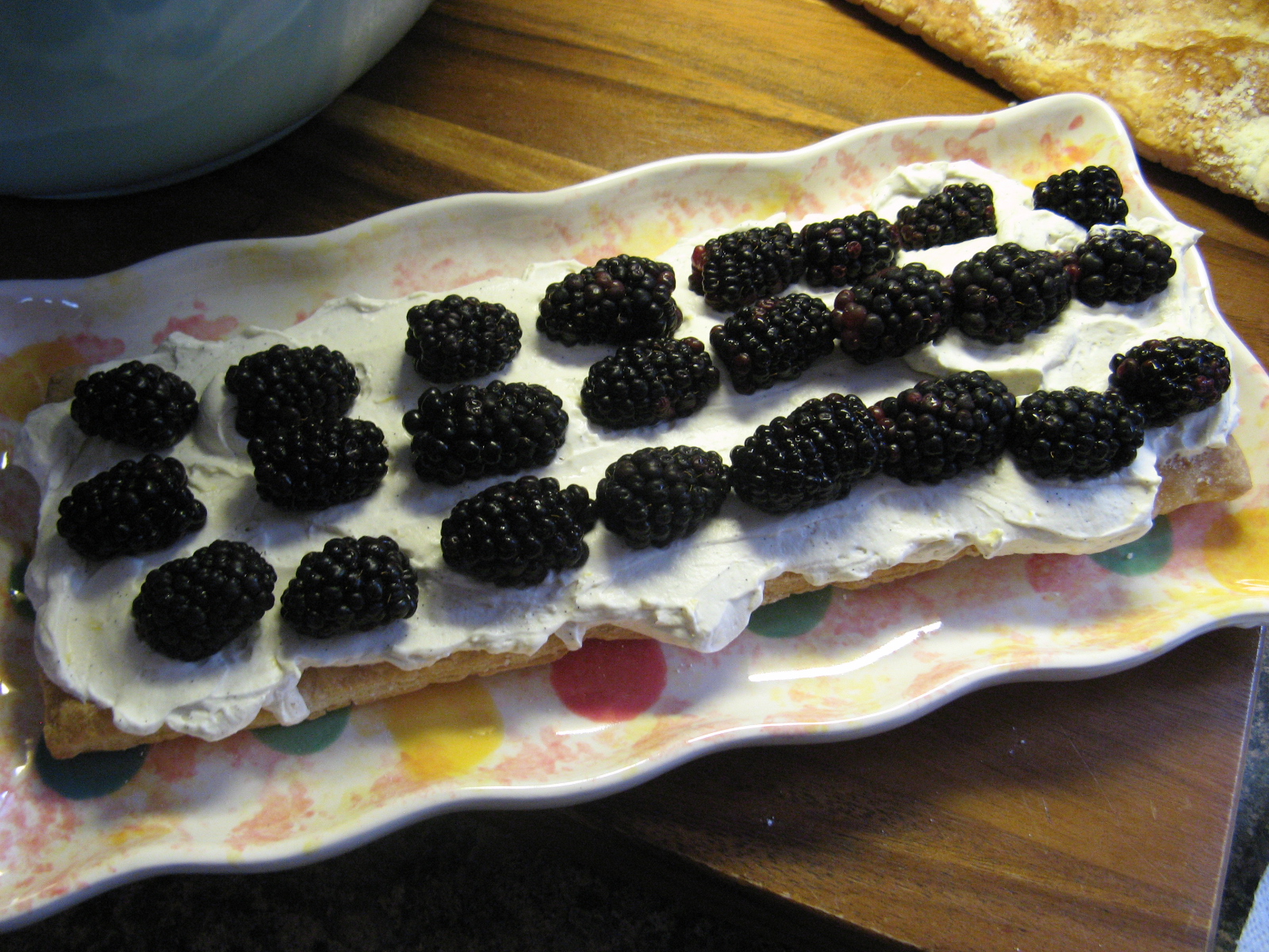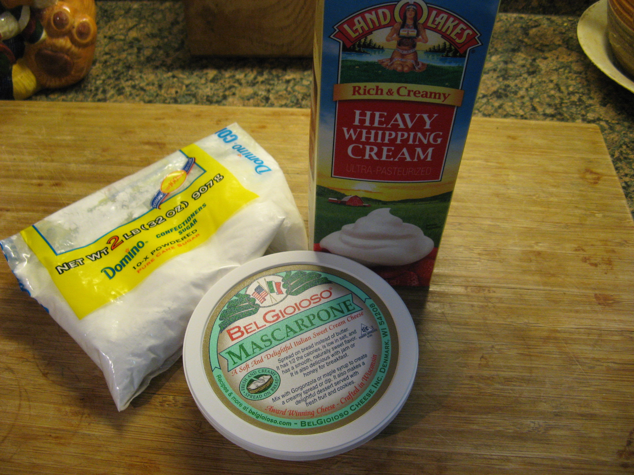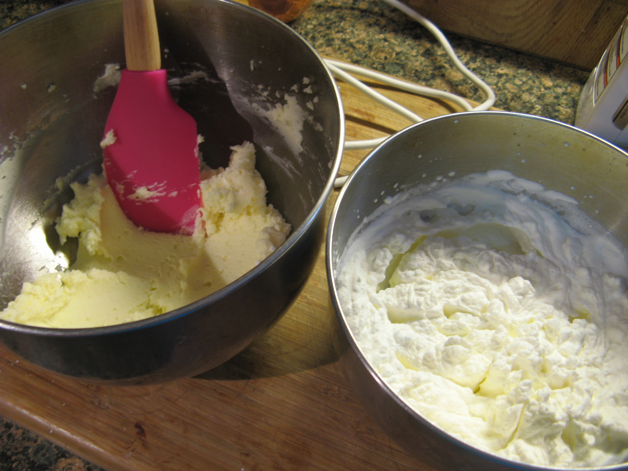 In one bowl I mixed the heavy cream until stiff peaks formed and in the other bowl I mixed together the mascarpone cheese and confectioners’ sugar until it was smooth.