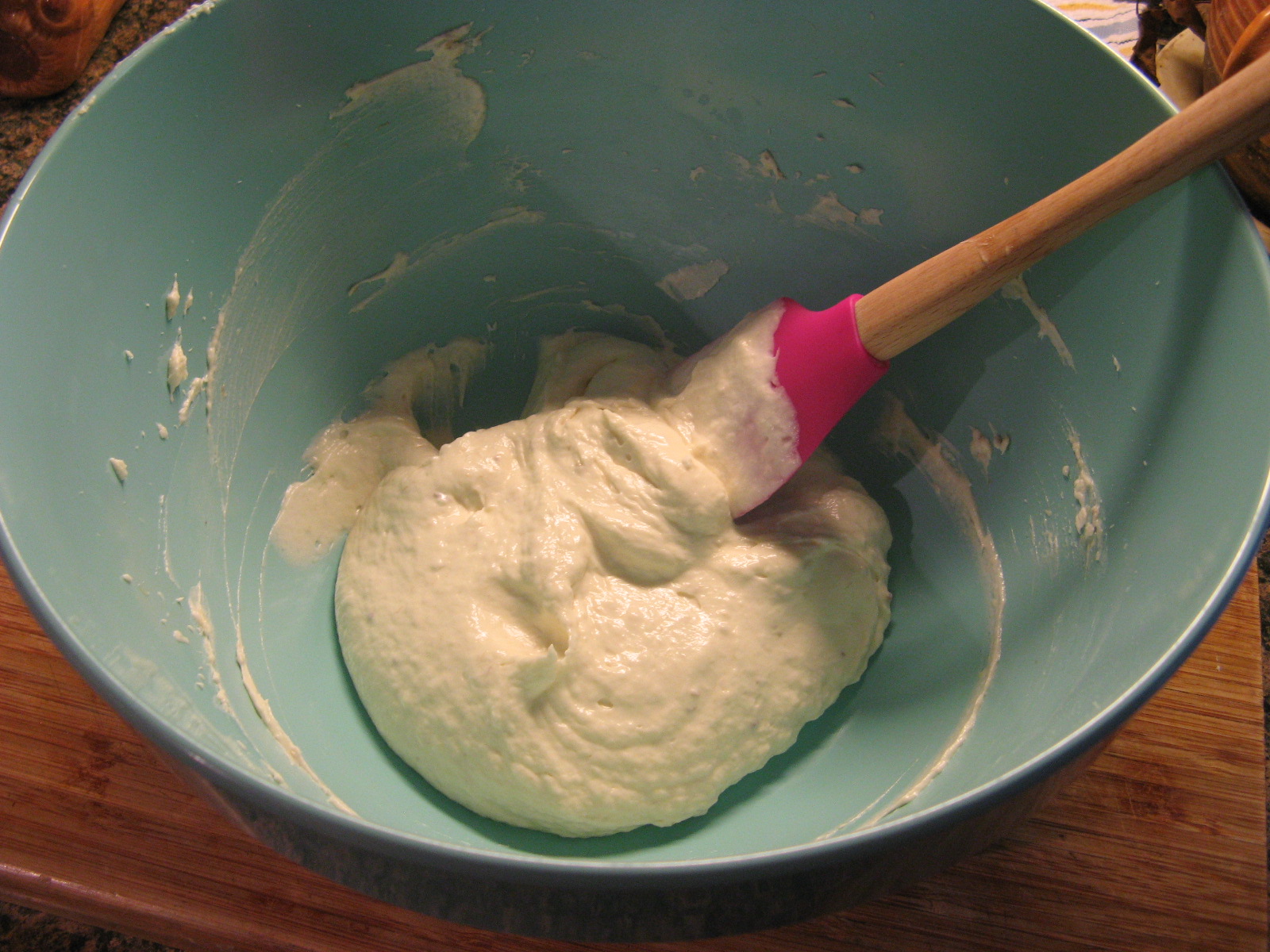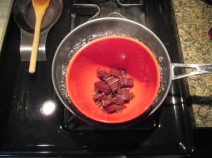 First ingredient… Melted semi-sweet chocolate. I melted the chocolate using a double-boiler. You could melt the chocolate in the microwave (which was always my preferred method,) but I find melting the chocolate in a double boiler minimizes the chance of scorching the chocolate and you can keep it warm while you’re working so it will stay smooth and thin. Whereas when you melt it in the microwave after a few minutes the chocolate begins to thicken. Creating a double boiler is quite simple… fill a medium saucepan about a little less than halfway with water – you don’t want to fill it too much because then when you place the bowl in the water it will spill over. Bring the water to a boil and then reduce the heat so the water is simmering. Place a heatproof bowl in the water, add chopped chocolate and stir occasionally until the chocolate has melted. Once the chocolate has melted, reduce the flame to low to keep the chocolate warm and add in the peppermint extract (the second ingredient), stir to mix in.