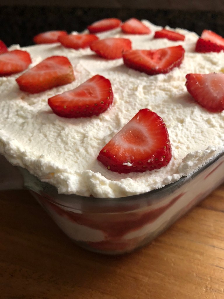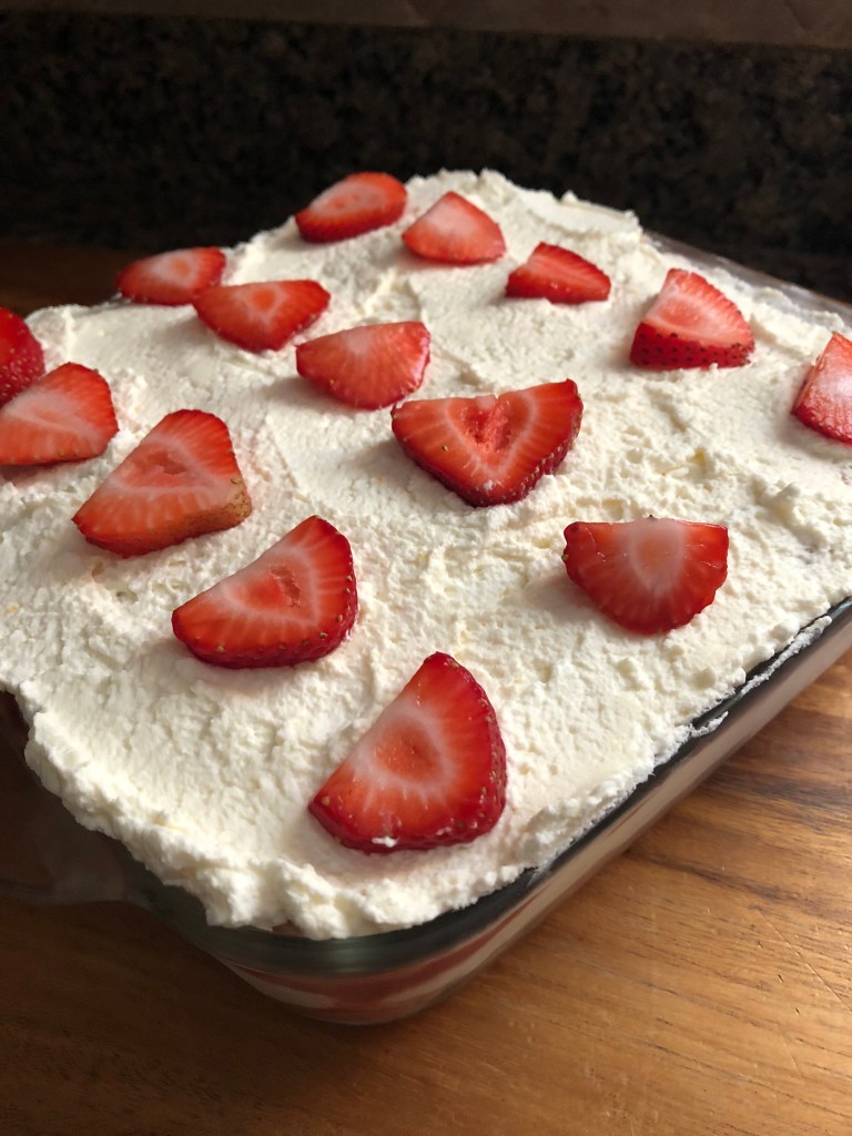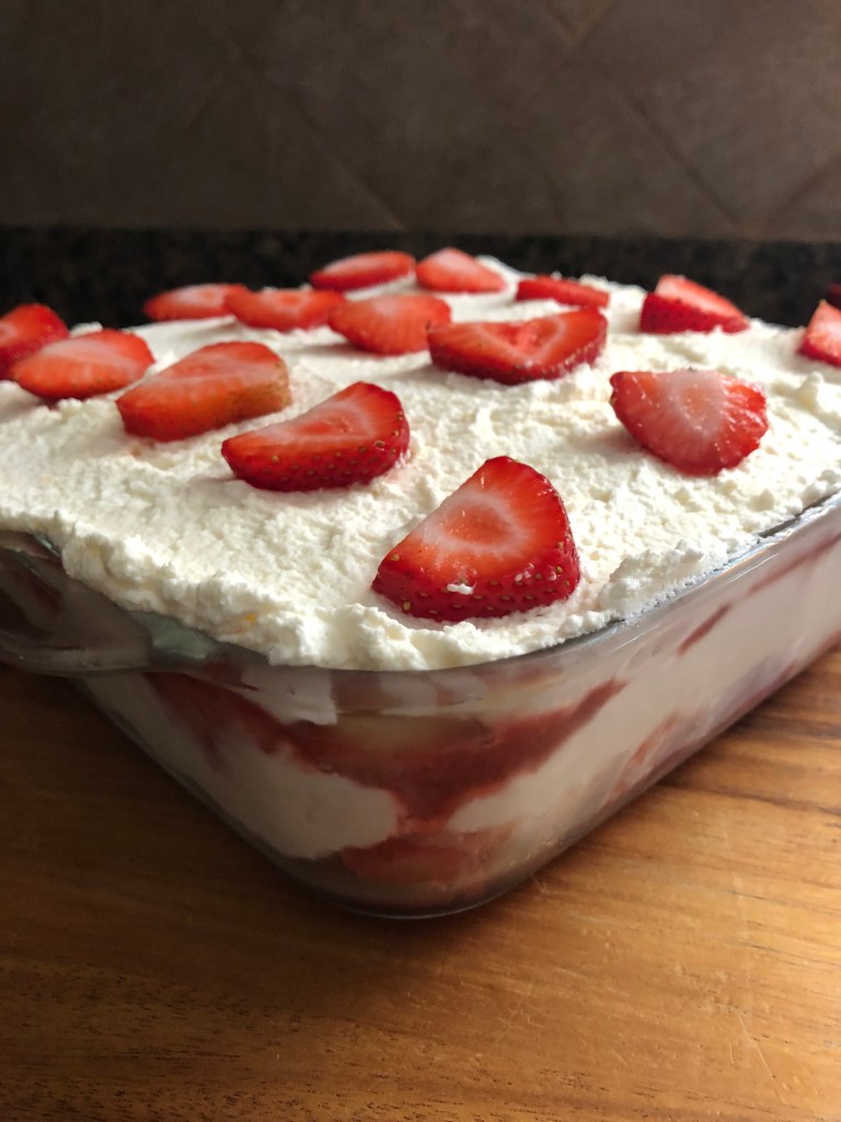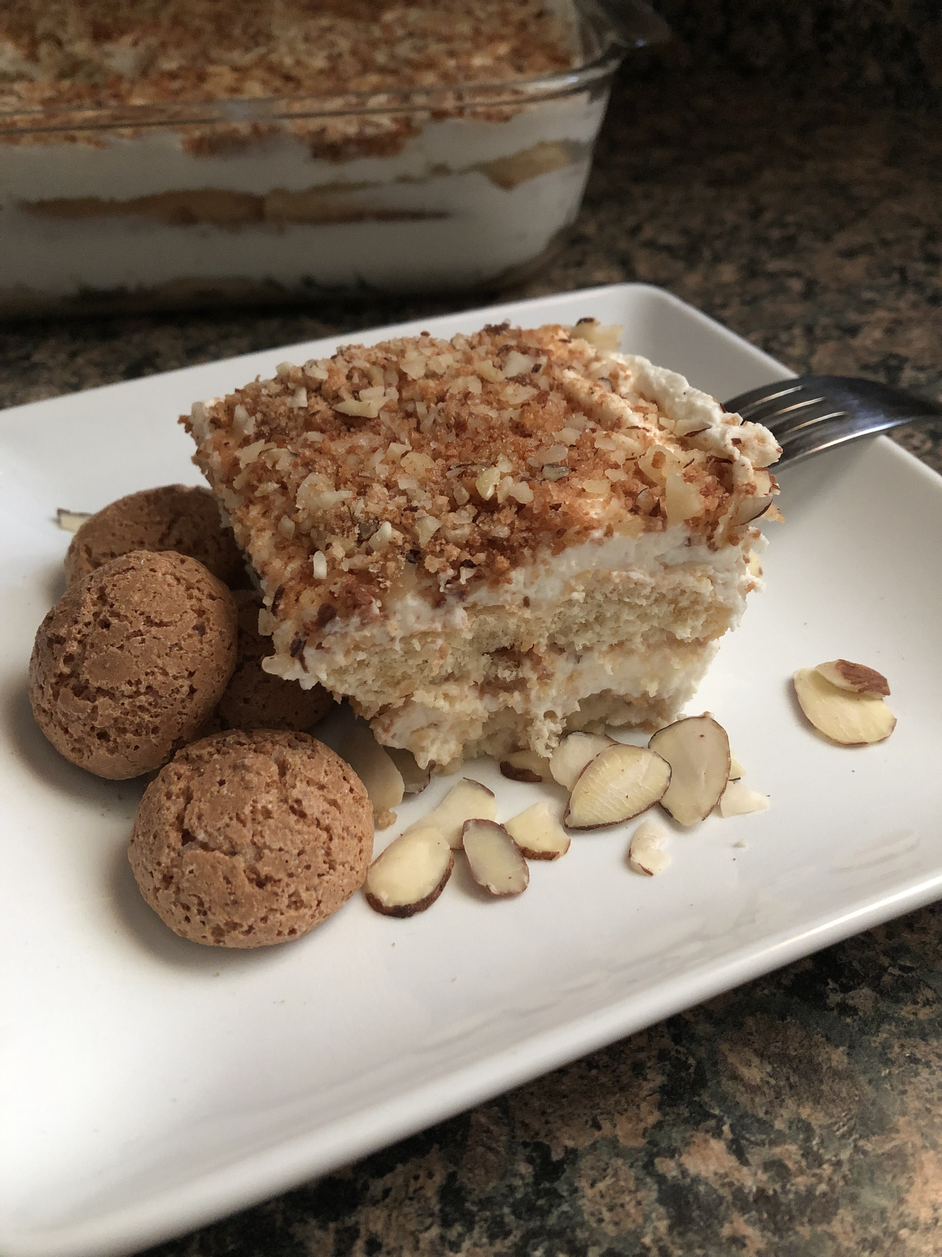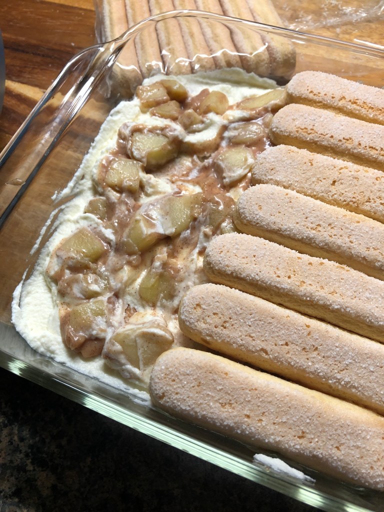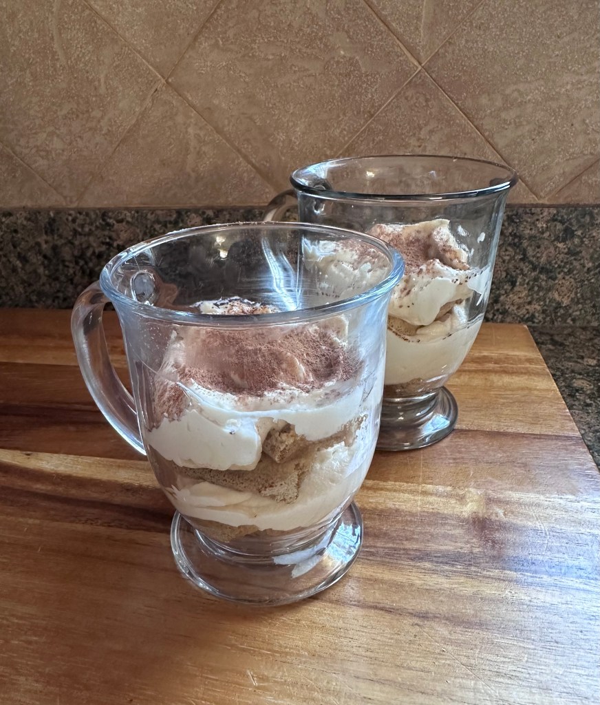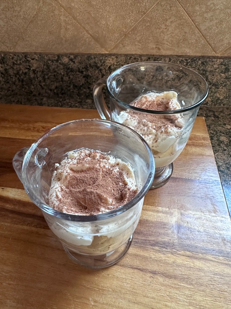 Arrange 3 of the ladyfingers in the bottom of 2 straight sided glasses / mugs. Top with 1/3 cup of the mascarpone mixture and then repeat the layers – ladyfingers and then the remaining mascarpone mixture. Top with a dusting of cocoa powder.