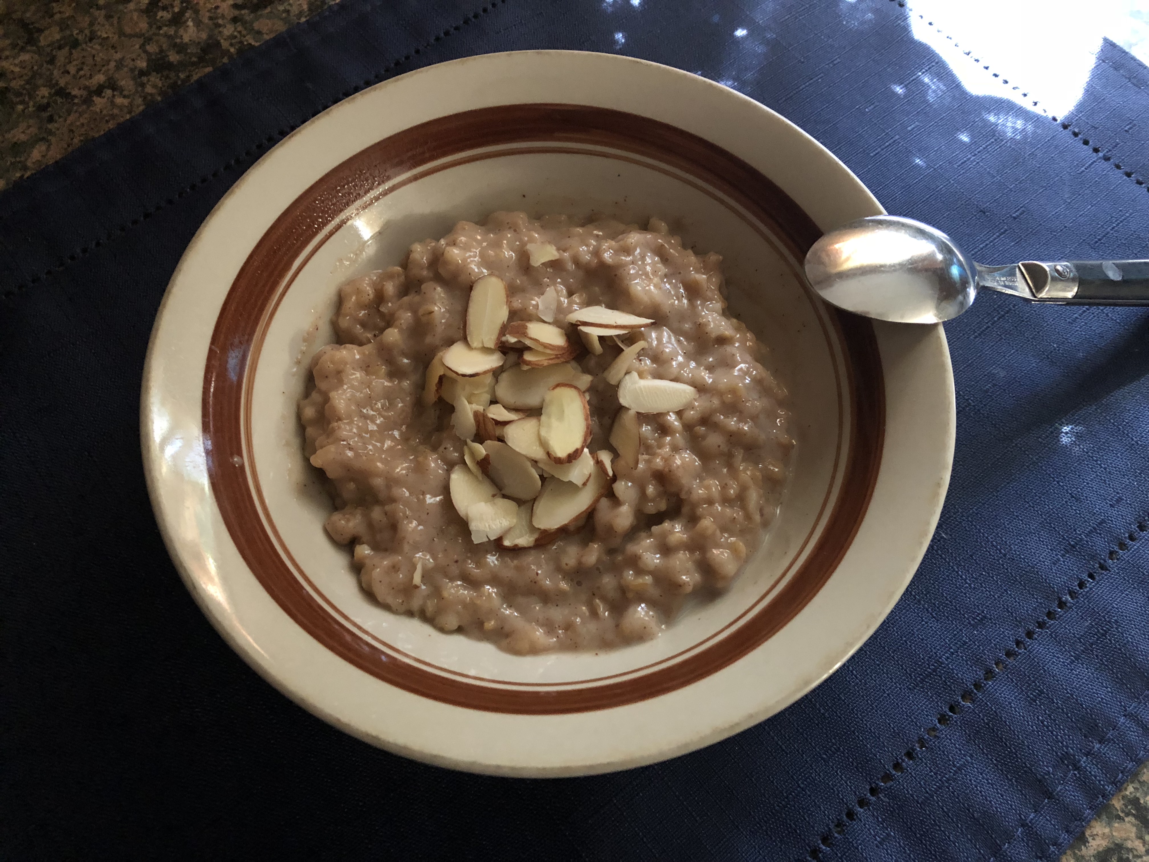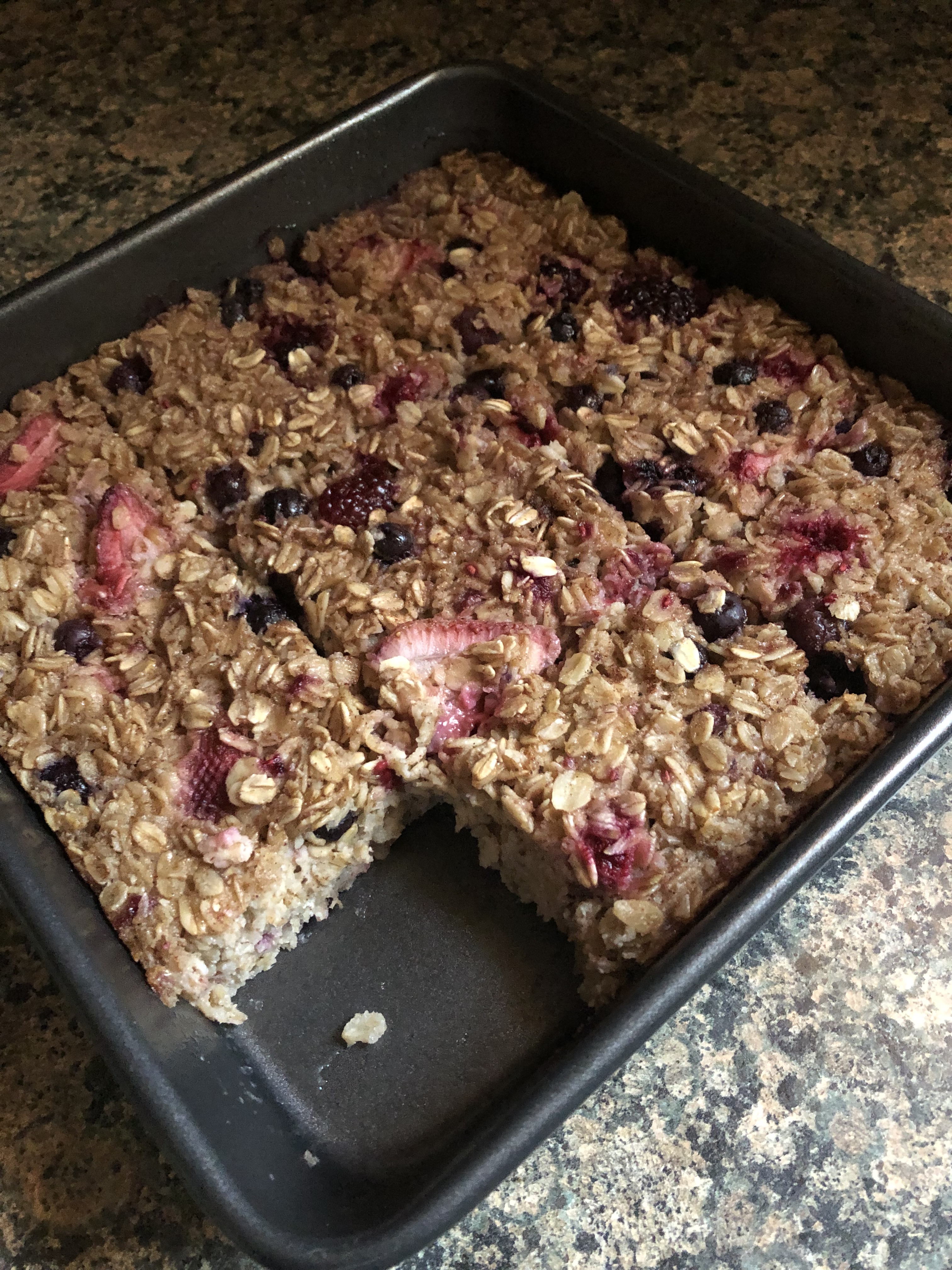 My go-to breakfast as of late has been 2 slices of wheat bread with peanut butter along with a bowl of fruits and veggies. On the weekend’s I cheat a little and the peanut butter becomes butter with a schmear of jam on top. I’ve been wanting to cut back on eating so much bread though and was trying to think of something else that would be quick and filling to eat. I used to eat hard-boiled eggs, but sometimes they become a little hard to swallow. And while I love oatmeal, I just don’t feel like making it every day and I haven’t gotten my measurements just right to make a big batch over the weekend to have for the week. I finally found something though that is delicious, healthy, and filling… Baked Oatmeal. I made this on a Sunday afternoon and I had breakfast for the entire week. I just heated in the microwave for about :45 seconds before enjoying. The first time I made it I used frozen mixed berries and the second time, a diced apple. Both versions were equally delicious.