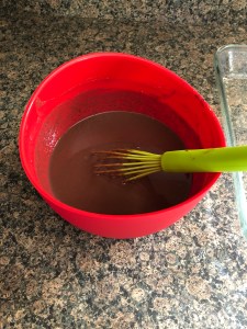 I began by melting together semi-sweet chocolate, peanut butter and milk in the microwave. I heated it for about 2 minutes and then whisked the mixture until it was smooth.