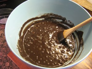 Divide the batter in half and stir the peanut butter in one half and the cocoa powder in the other.