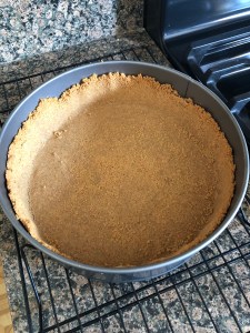 To begin I made the crust for the pie. In my food processor I pulsed 12 graham crackers into crumbs and then added in sugar and melted butter and pulsed everything together a few more times. I then transferred the mixture to a 9-inch springform pan and pressed it into the bottom and up the sides of the pan. I used the bottom of a glass to get the crumbs spread out evenly and the sides of the glass to press them evenly along the sides. I placed the pan on a baking sheet and then baked the crust in a 350 F preheated oven for 10 minutes. I then let it cool on a wire rack while I worked on the chocolate mousse.