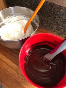 I then gently folded the cooled melted chocolate into the heavy whipped cream. I continued folding the two together until they were well incorporated and no streaks of either the whipped cream or melted chocolate remained. I made sure to scrape the bottom of the bowl as I folded.