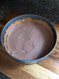 I then spread the chocolate mousse into the cooled graham cracker crust and refrigerated it while I made the peanut butter mousse.