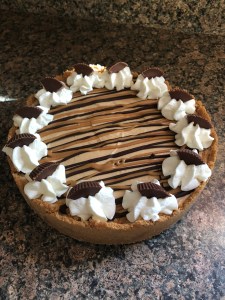 Now, you could enjoy the pie as is, but I decided to spruce it up a little. I melted semi-sweet chocolate chips and creamy peanut butter in the microwave and put each in a piping bag, snipped off the end and drizzled each on top of the pie. I then made whipped cream and piped dollops of it around the pie using a Wilton 1M tip and finally I quartered 3 Reese’s Peanut Butter Cups and placed them on top of the whipped cream. By the way, I had no clue that Reese’s Peanut Butter Cups had gotten so small. The packaging is still the same size, but I am sure the candy itself has shrunk a little since I was a kid.