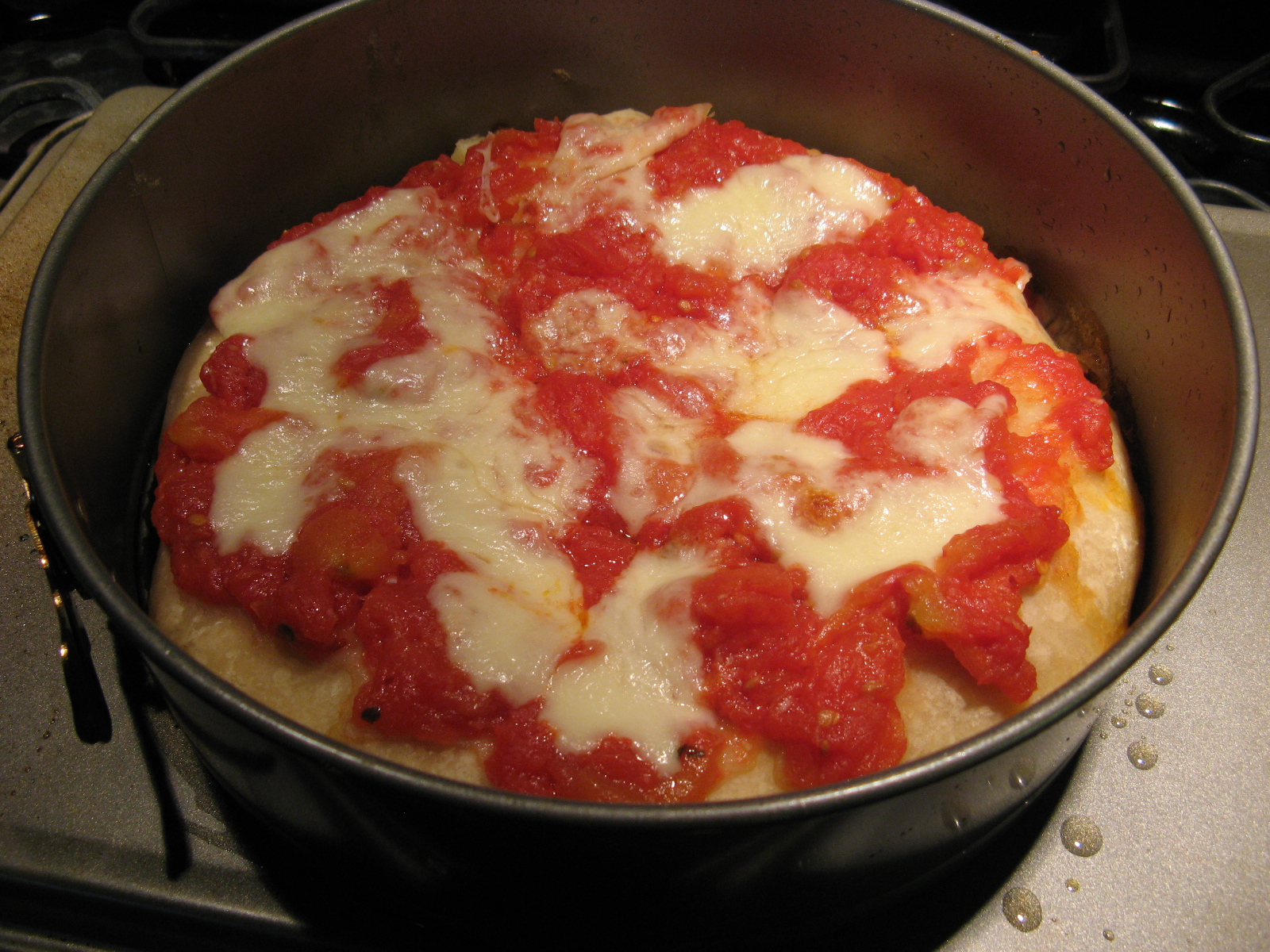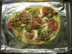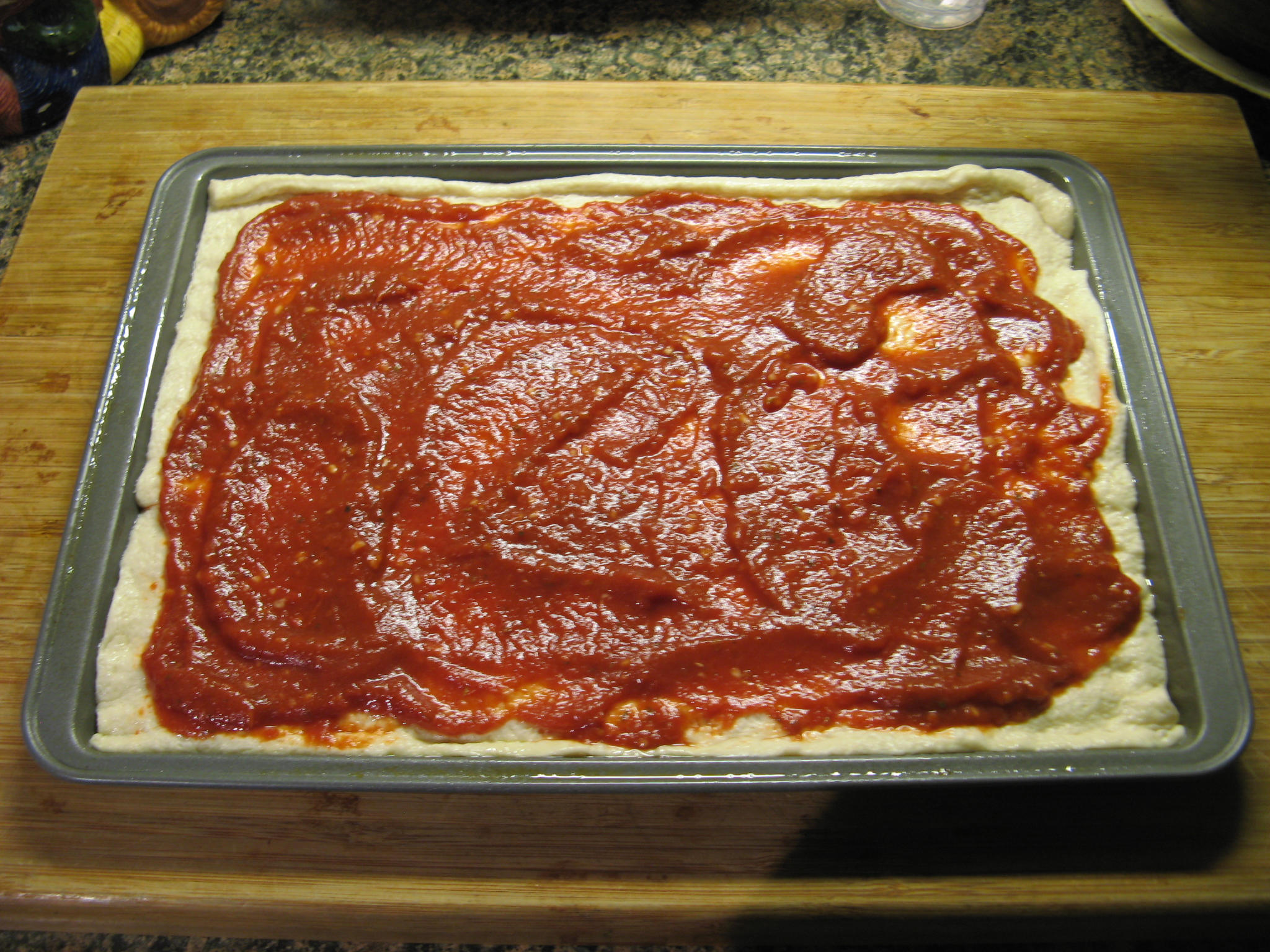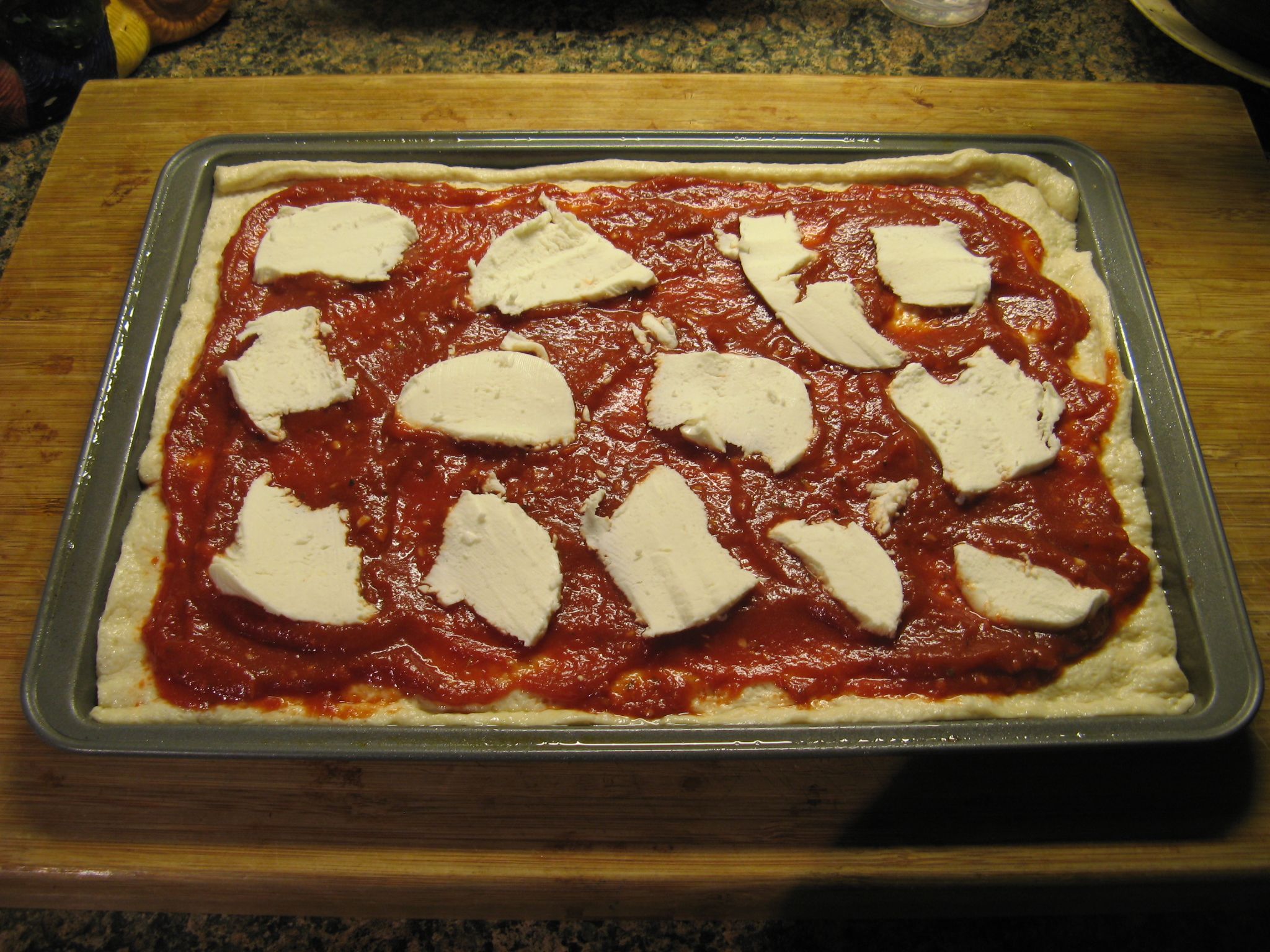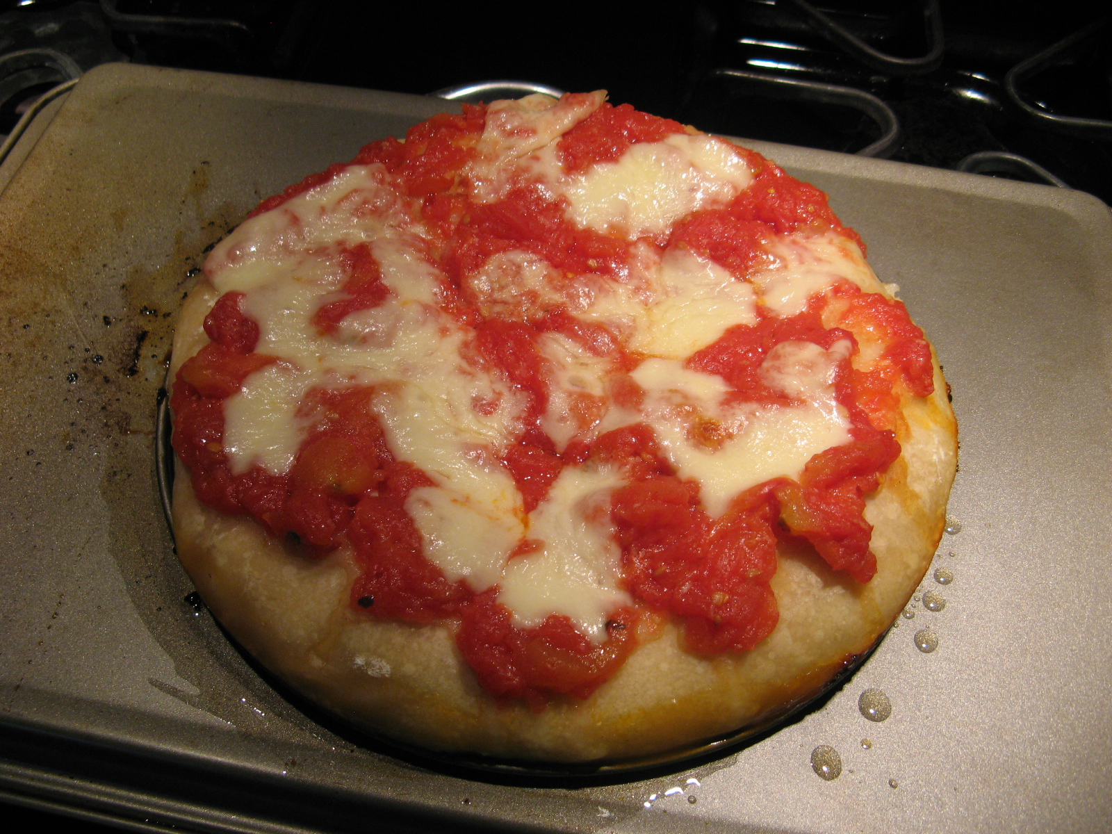 And then it was time for them to become “pizza.” I topped them with marinara sauce and sprinkled them with mozzarella and Parmesan cheese.
