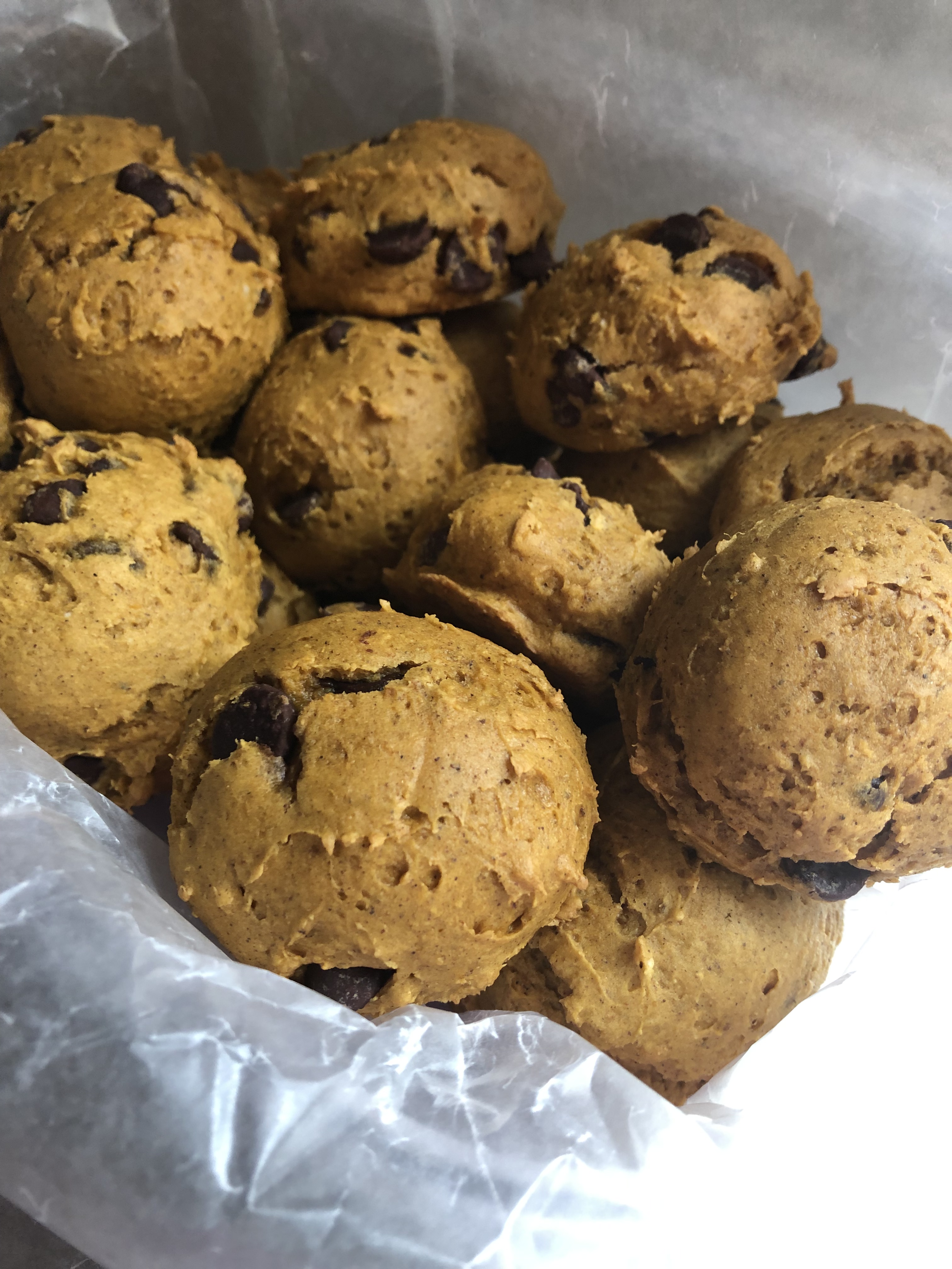 In a large bowl whisk together the brown sugar and cooled brown butter. It should resemble clumpy wet sand. Next whisk in the egg yolk, maple syrup, vanilla extract and pumpkin puree until smooth. Fold in the dry ingredients. Continue folding the two mixtures together until the dough forms.
