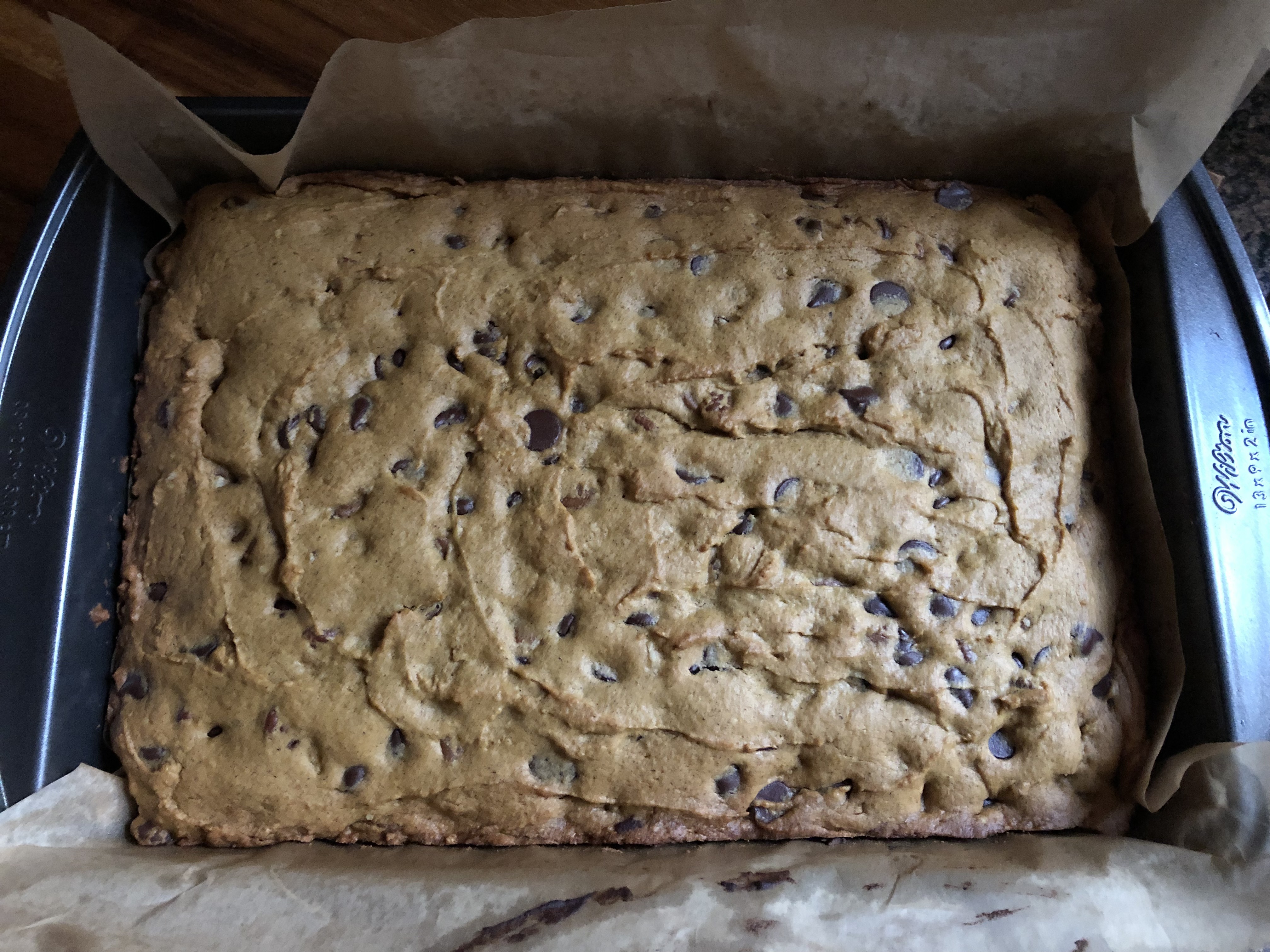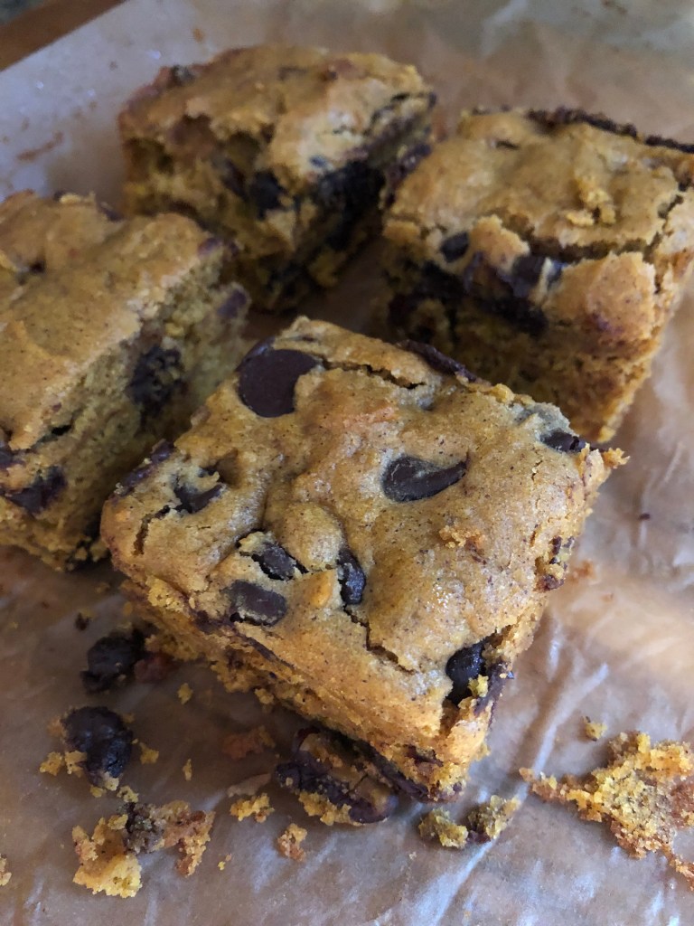 In a large bowl whisk together the brown sugar and cooled brown butter. It should resemble clumpy wet sand. Next whisk in the egg yolk, maple syrup, vanilla extract and pumpkin puree until smooth. Fold in the dry ingredients. Continue folding the two mixtures together until the dough forms.