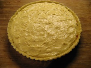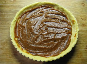 I started out by spreading Pecan Pumpkin Butter, which I bought from Williams & Sonoma, on the bottom of my dough. Unfortunately this is a seasonal item so it’s only available in the early fall. But, this isn’t the only thing you can use as the base for this tart. You could actually use fruit, jams/jellies, pudding and so forth. The frangipane is what really gives this tart it’s burst of flavor so whatever you use as the base is just a complement to that.