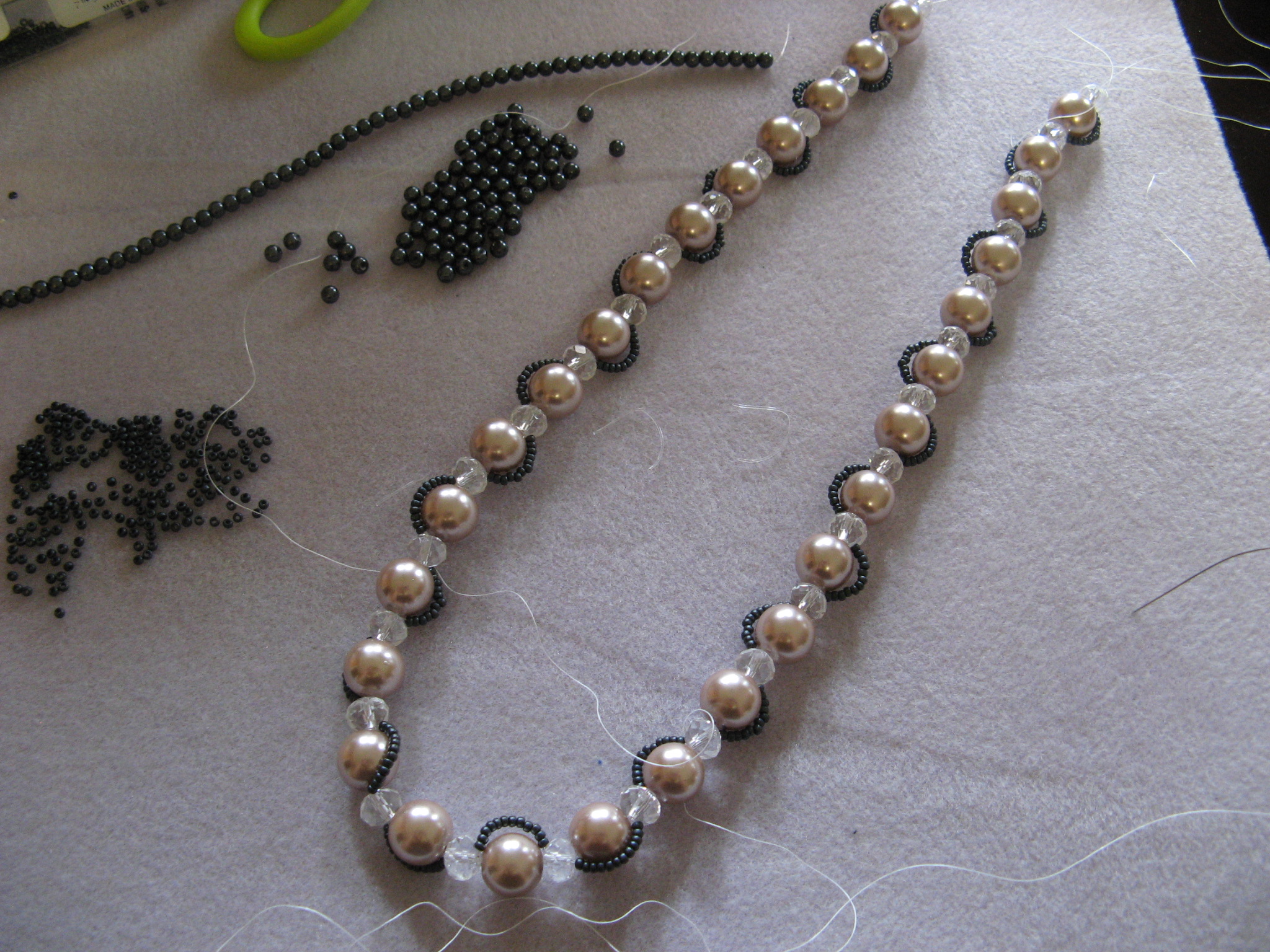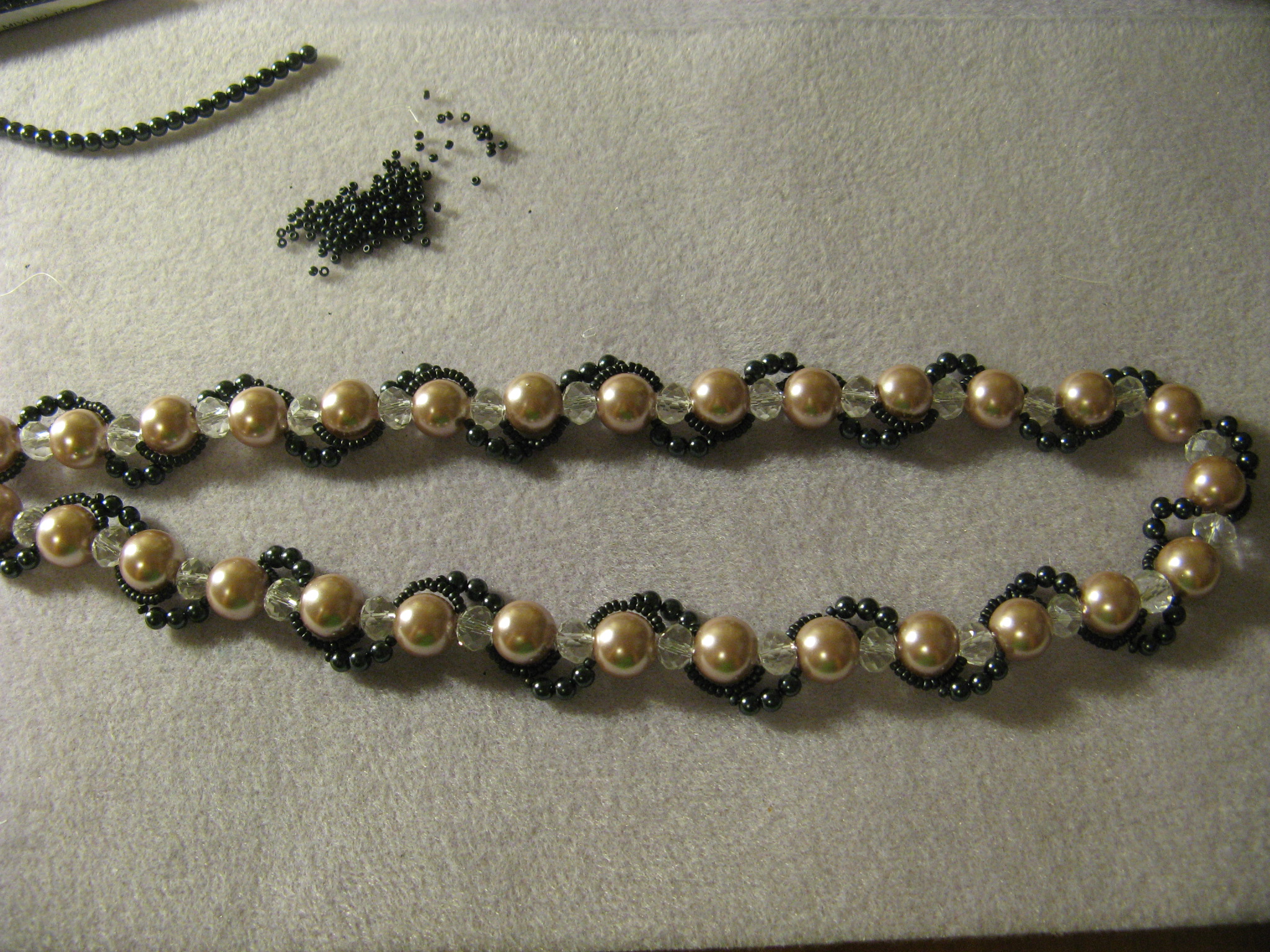 I then added five size 15 seed beads by stitching my thread through the size 11 seed beads I had just added, which basically left the size 15 seed beads arching around the pearls. I was concerned at this point because the size 15 seed beads weren’t sitting flat. I kept playing with the thread by pulling it snug and then loosening it in an attempt to have them fall flat, but, it didn’t work. Luckily the final step rectified the problem.