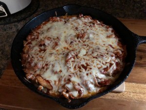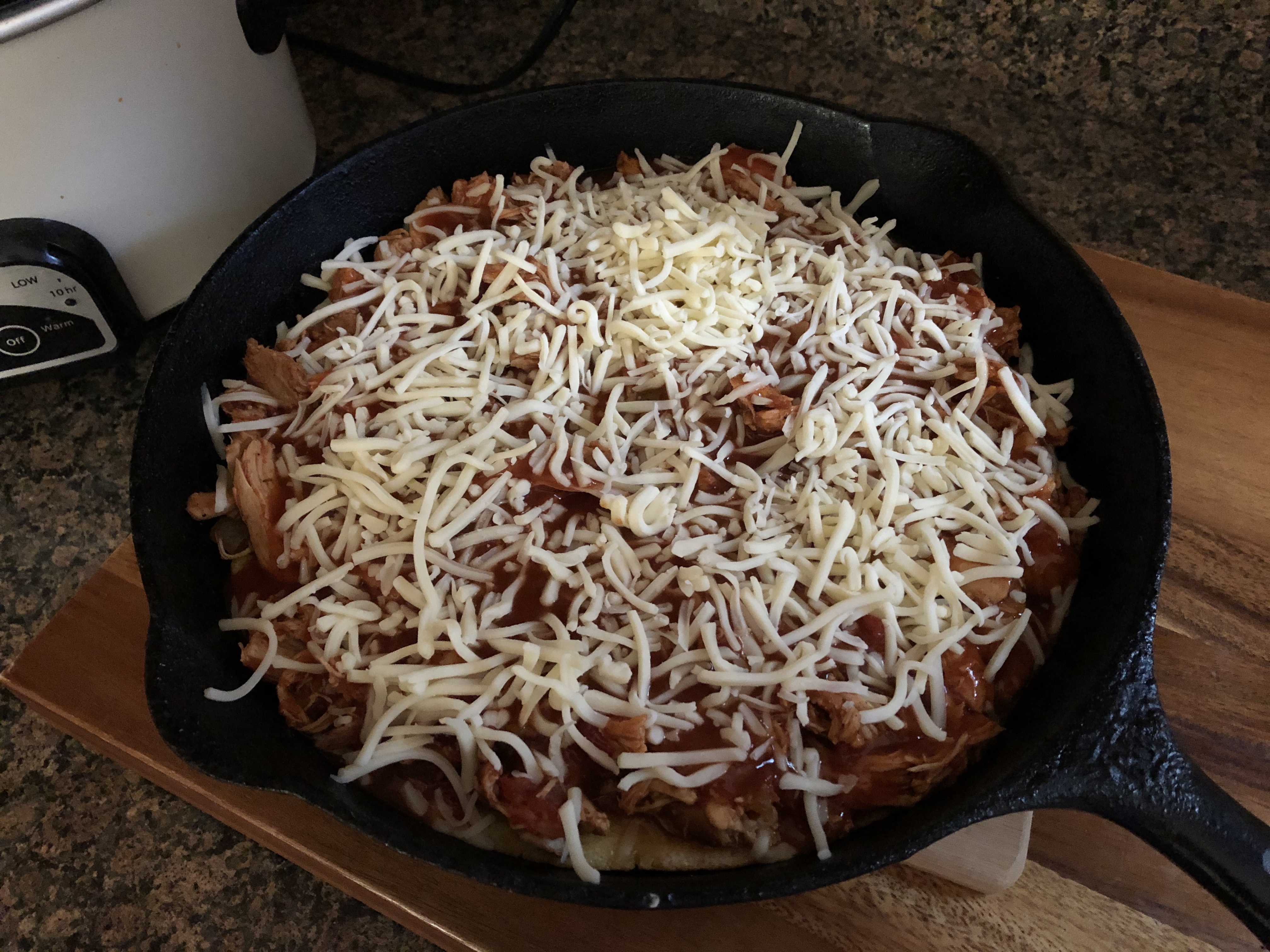 I removed the skillet from the oven and poked the cornbread with a fork several times. I then topped the cornbread with the cooked shredded chicken. Next I poured red chile enchilada sauce over the chicken and topped the sauce with shredded Monterey-Jack cheese. I returned the skillet to the oven and baked it for about 15 minutes, until the cheese melted.
