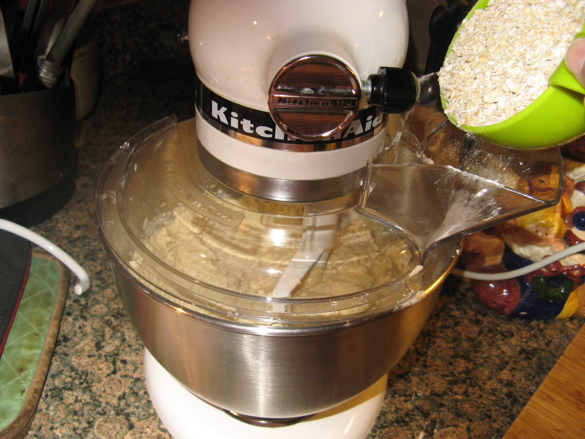 In a medium bowl whisk together the flour, oats, baking soda and salt. Set aside.