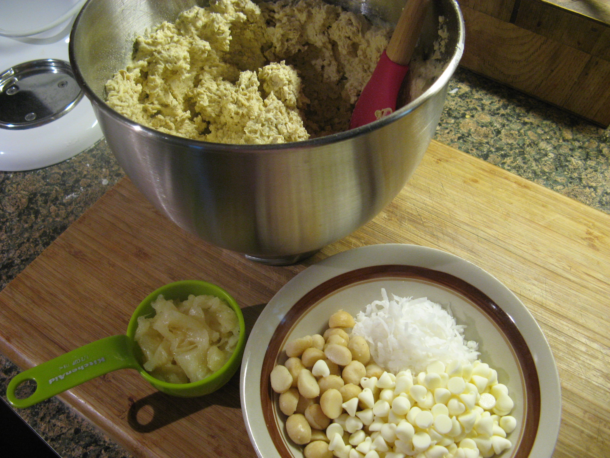 Fold in the macadamia nuts, shredded coconut and pineapple tidbits.
